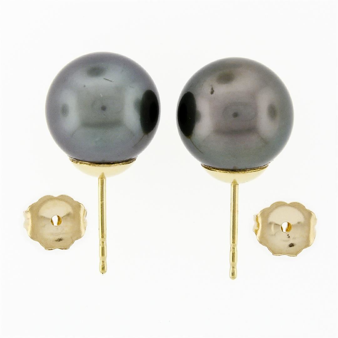 A solid 18k yellow gold stud earrings, with 2 round shape natural tahitian pearls (10.75mm and 10.90mm). The earrings measure approximately 10.75mm to 10.90mm in diameter and weigh a total of 4.51 grams.