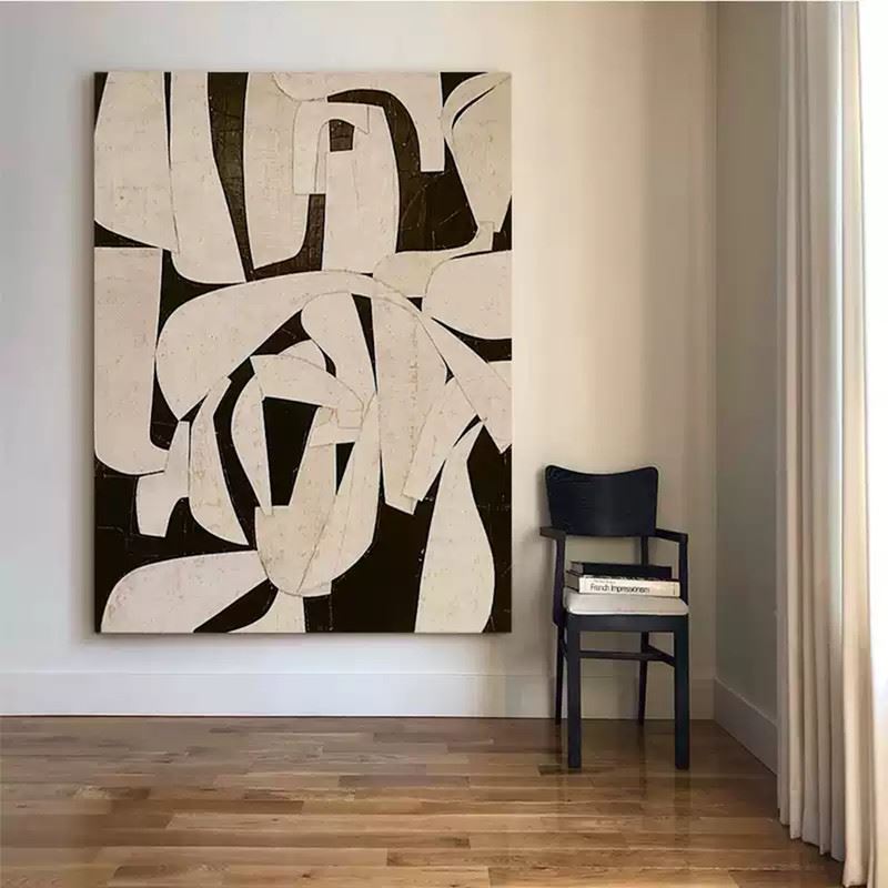 This artwork uses contrasting black and white geometric shapes and clean lines to present a modern abstract aesthetic. The scattered and intertwined shapes showcase the pure visual impact and minimalist power of the artwork. Dimensions: 24 x 31 inches.