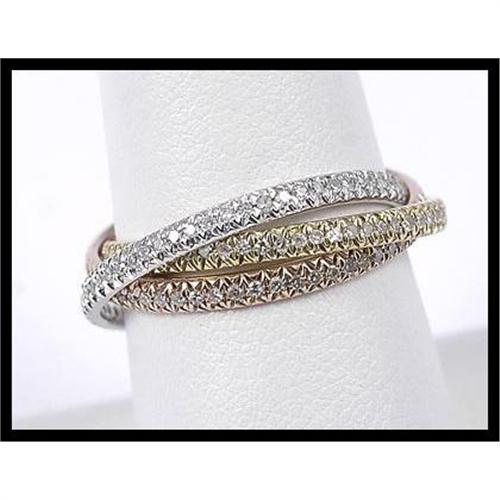 This set of 14K tri-color diamond eternity band sets with 169 small round diamonds that have an estimated total weight of 0.69 carats. This set of diamond bands weights 3.5 grams and is in size 7.