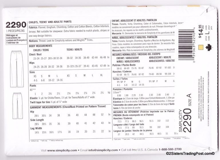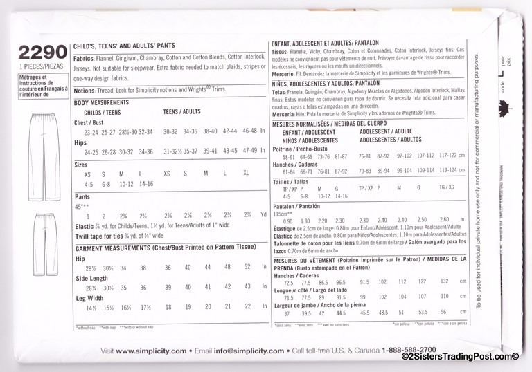 Simplicity Learn to Sew child's, teens' and adults' pants. Pattern #2290 Size A XS-L/XS-XL MSRP $14.95