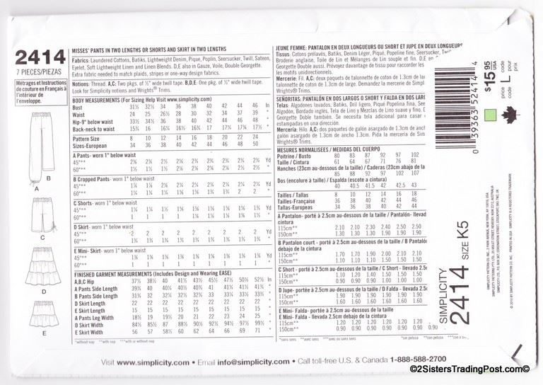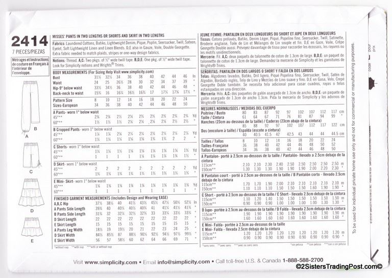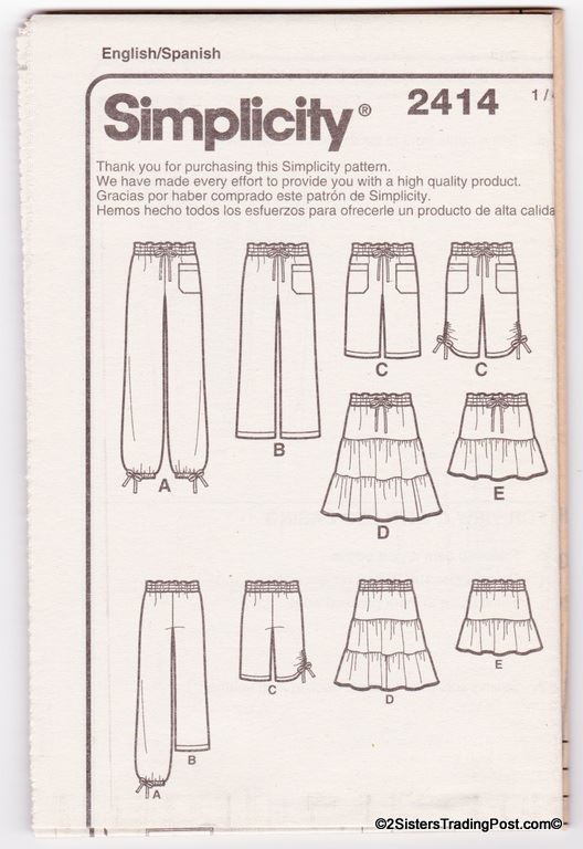 Simplicity 1 hour misses' pants in two lengths or shorts and skirt in two lengths. Pattern #2414 Size K5 8-10-12-14-16 MSRP $15.95
