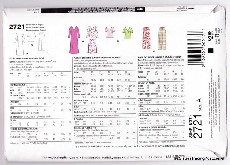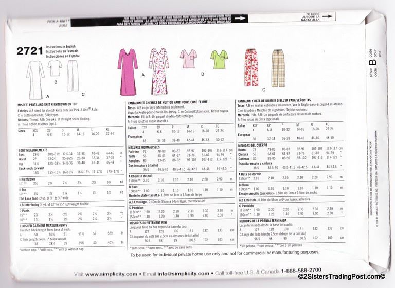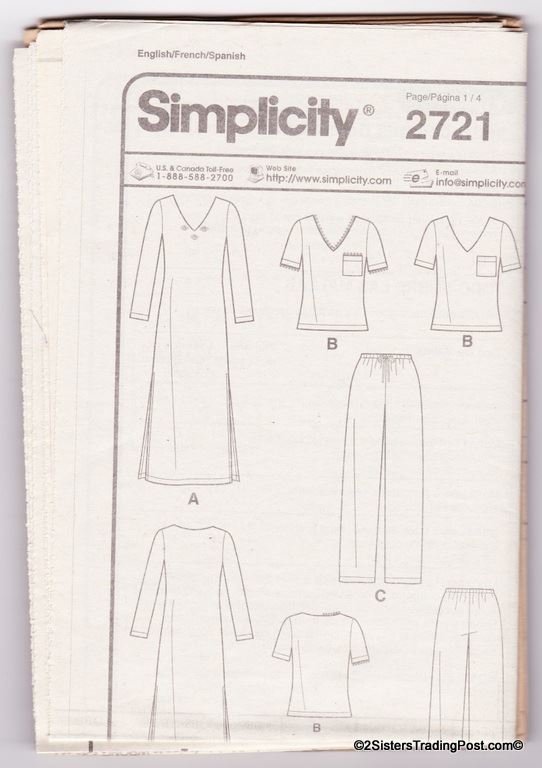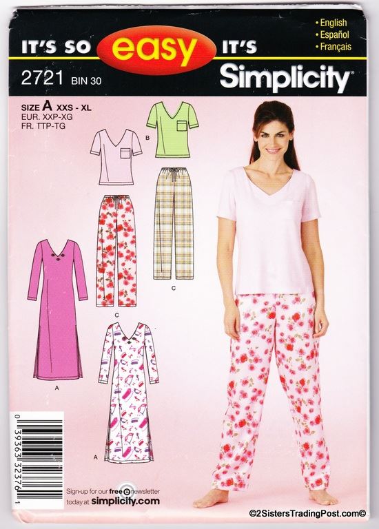 It's So easy It's Simplicity Misses' pants and knit nightgown or top. Pattern #2721 BIN 30 Size A XXS-XL MSRP $2.99
