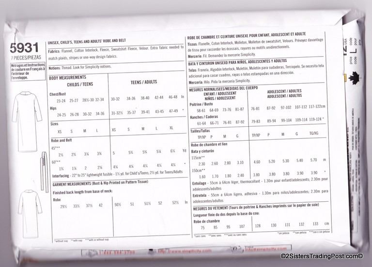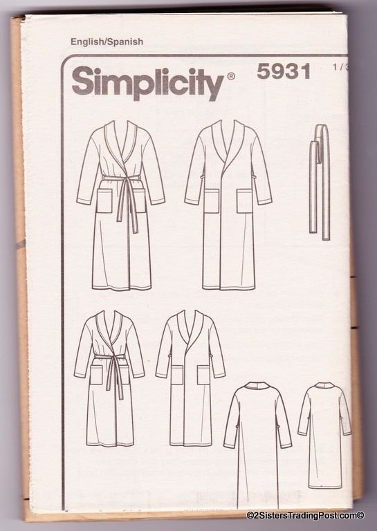 Simplicity @ Home easy-to-sew unisex, child's, teens and adults' robe and belt. Pattern #5931 Size A XS-L/XS-XL MSRP $12.95