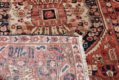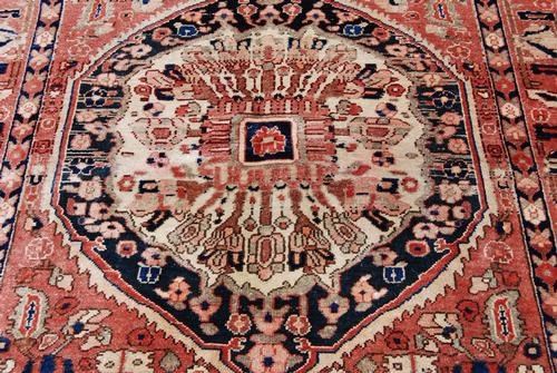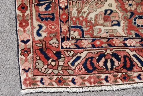 Simply beautiful fine quality semi antique Persian Heriz rug. Size 4.3 x 8.1 feet, made of fine quality baby lamb's wool pile on cotton foundation, all natural vegetable dye, incorporating a magnificently detailed geometric pattern on a red-brown background; beautiful teardrop centerpiece floral medallion; and contrasted nicely with an intricate floral border. Please notice the extreme amount of detail and quality that went into making this fine quality, hand woven authentic Persian Heriz. From Heriz, Iran. This beautiful work of art would look great in any room of the house.