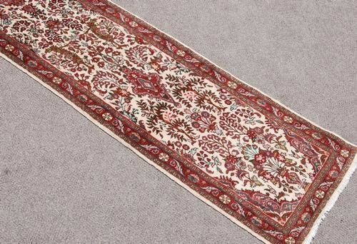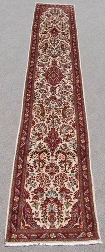 Stunning genuine handmade Persian Heriz runner, size 2.5 x 14.10 feet, made of fine quality baby lambs wool pile on cotton foundation, all natural vegetable dye, incorporating a magnificently detailed free flowing floral pattern on a rich ivory background, beautiful three 4-way centerpiece floral medallion, and contrasted nicely with an intricate dark red floral border. Hand woven in Heriz, Iran.