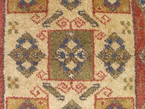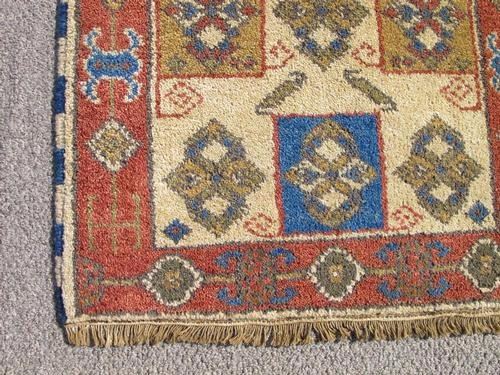 Rug: Hand Woven Kazak Design; Material: Fine quality wool pile, all natural vegetable dye; Size: 2.2 X 4.2 feet; Foundation: Cotton; Design: Kazak; Origin: Nepal;