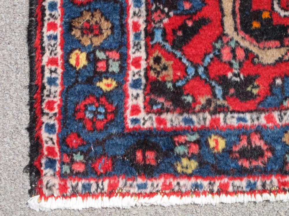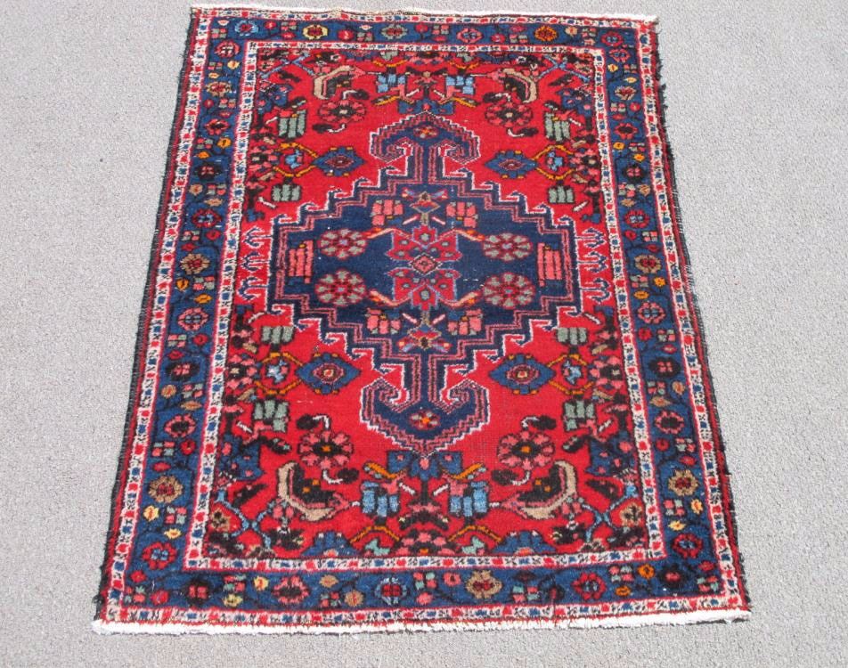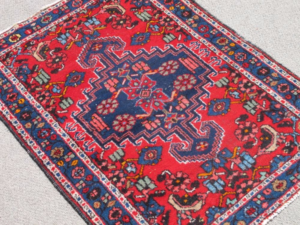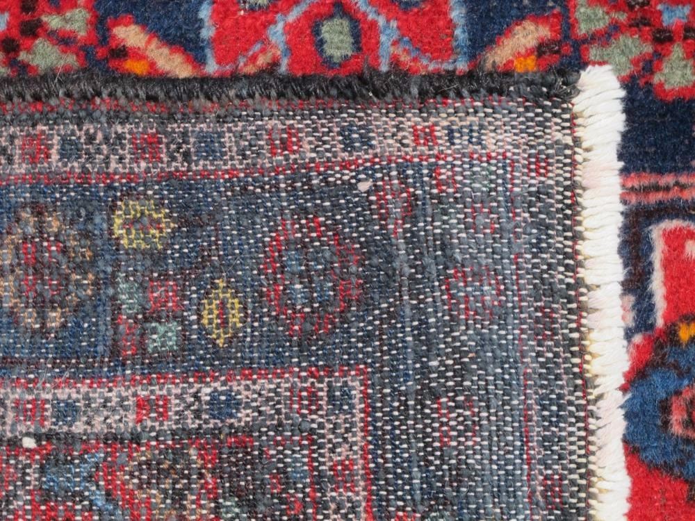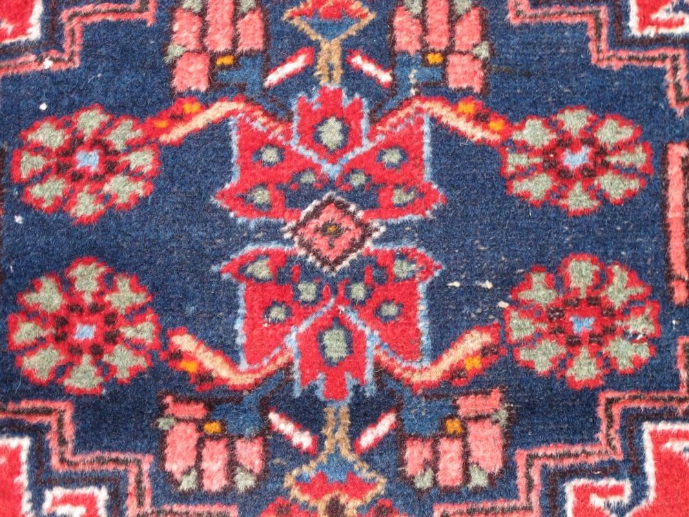 Rug: Handmade Semi Antique Persian Hamadan; Material: Made of the finest quality baby lamb's wool, all natural vegetable dye; Size: 4.10 x 3.5 feet; Foundation: Cotton; Design: Persian Hamadan; Origin: Iran