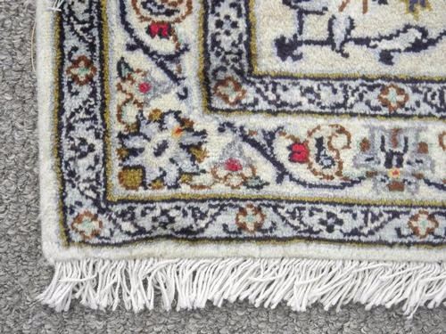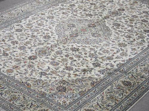 Very large room size authentic Persian Kashan. Size 10 x 13.4 feet, made of fine quality lamb's wool pile on cotton foundation, all natural vegetable dye, incorporating the traditional shah Abbasi floral pattern on a ivory background; large centerpiece medallion; crowned corners and finished off with an intricately done floral border. Please notice the size of this Kashan, which is rare and almost never found in this style and design. Hand woven in Kashan, Iran.