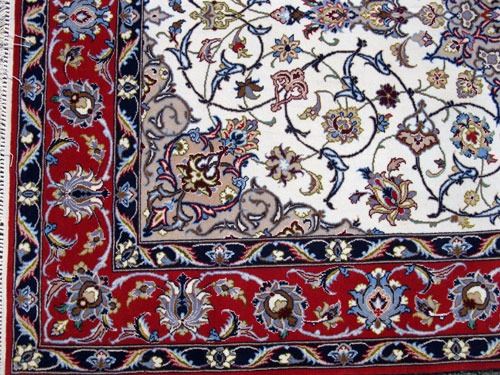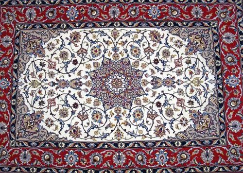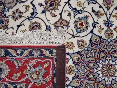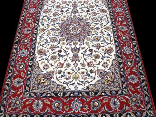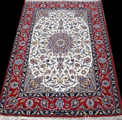 Strikingly Lovely Super Fine Signed Part Silk Persian Isfahan Rug. 100%Natural, hand woven, vegetable dye, pure silk, hand spun, highest quality baby lamb's wool pile on all pure silk foundation. This is an unbelievably lustrous fine Isfahan with a beautiful arabesque pattern on a gorgeous beige background with an exquisite sun burst central medallion. This captivating Isfahan is masterfully hand woven, knot by knot, and has about 400 knots per square inch. This lovely piece is signed by a renowned master weaver named "Tavassoli" and it would take a over three years to create this captivating piece. The silk highlights give this delightful Isfahan a three dimensional character. The leather band sewn on the edge on the back of this rug is to prevent the edges from curling under due to the extreme tightness of the weave. Size: 7 feet 5 inches X 3 feet 9 inches. Country of Origin: Iran.