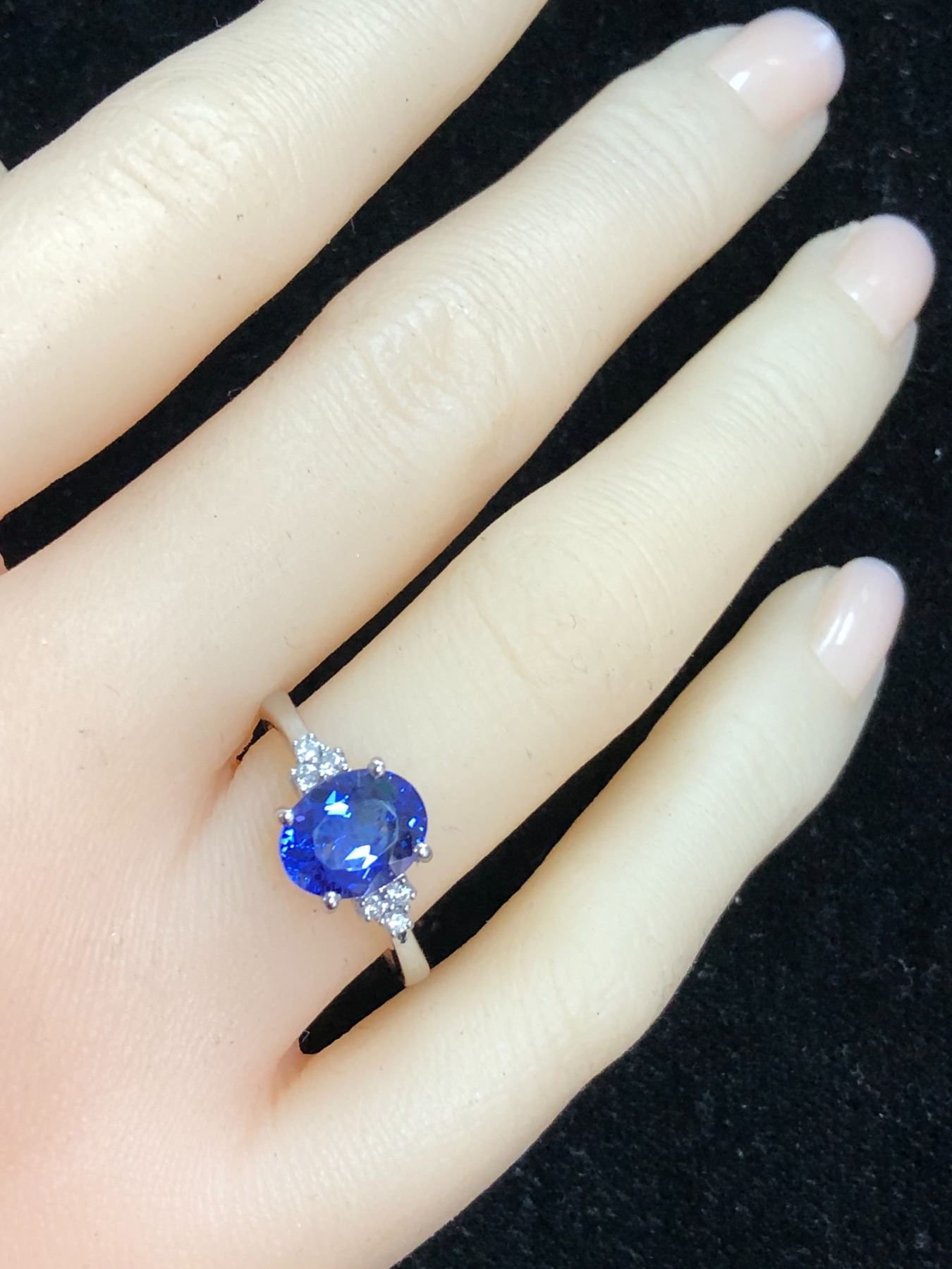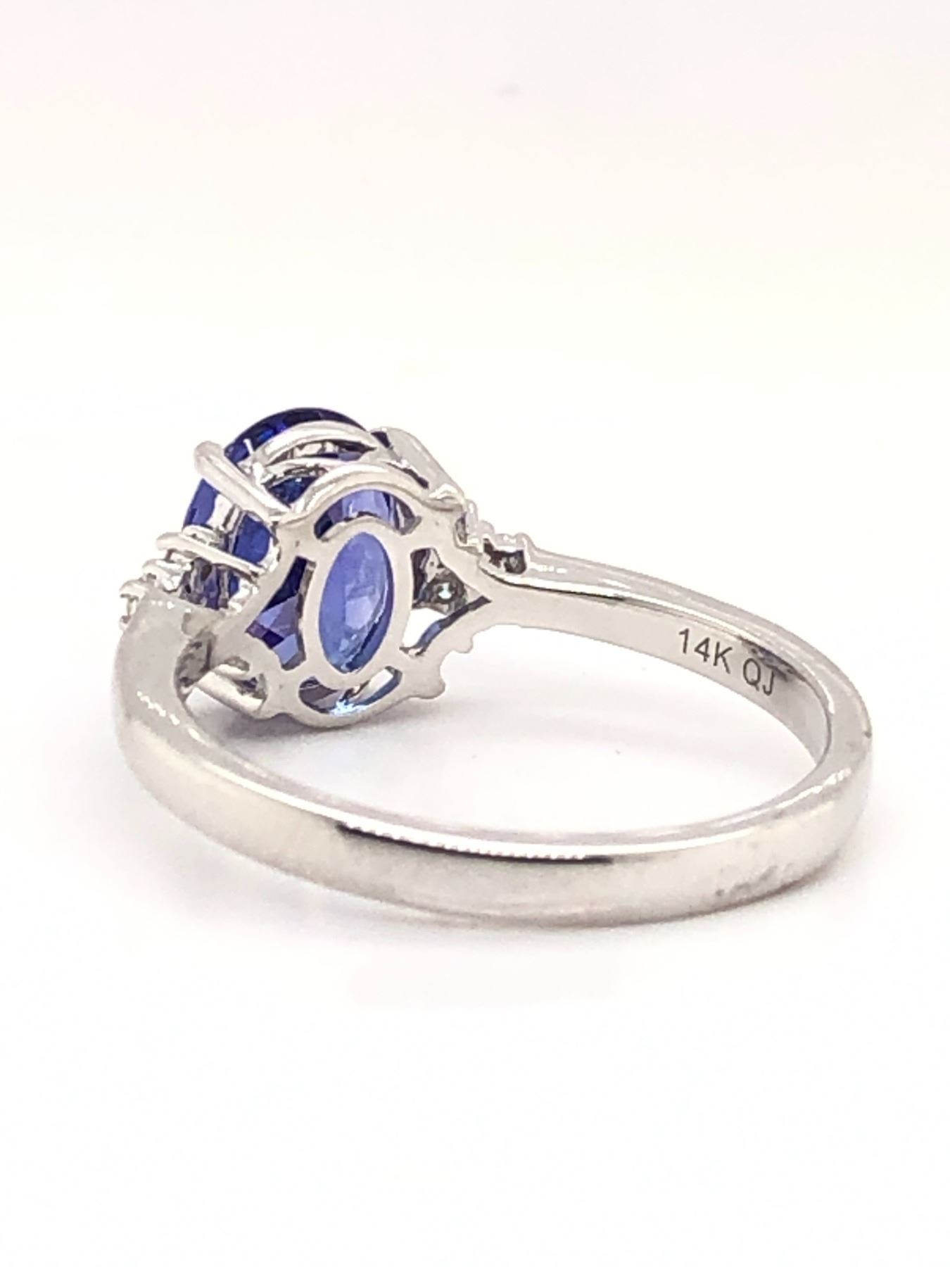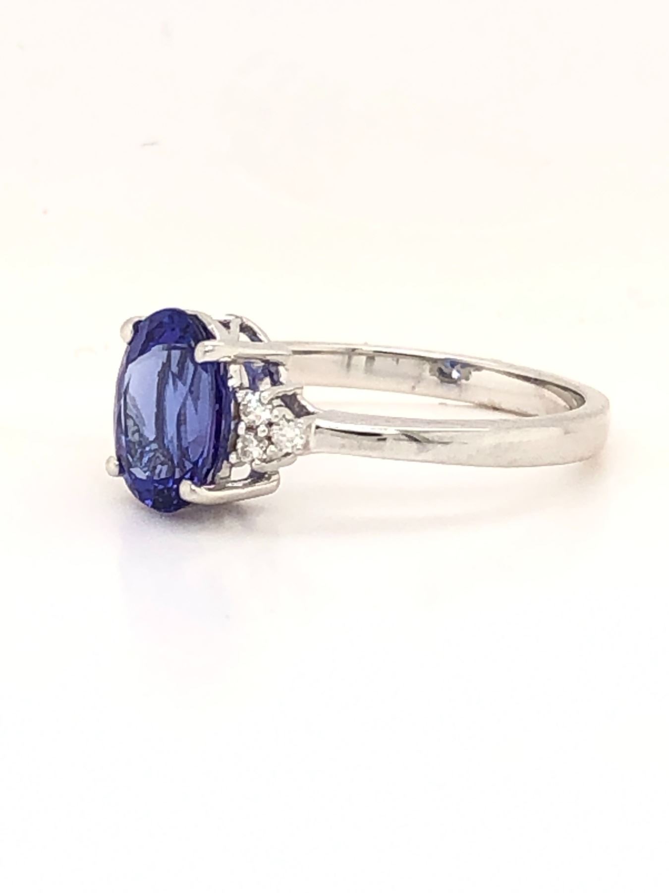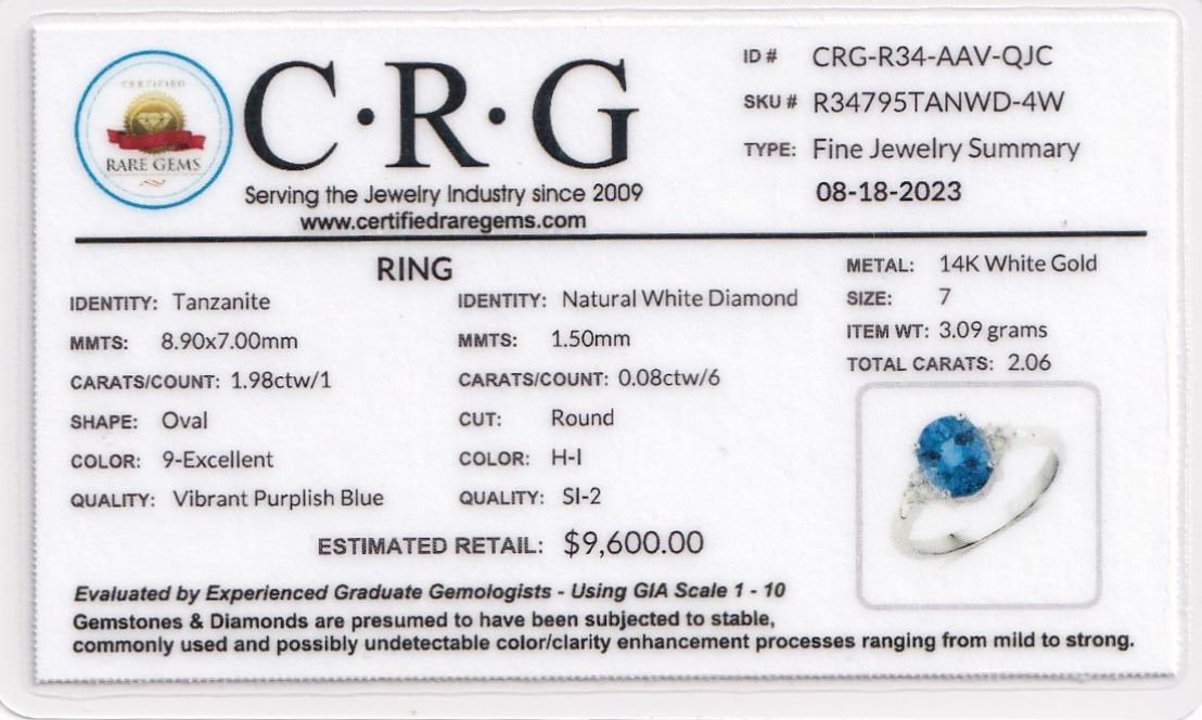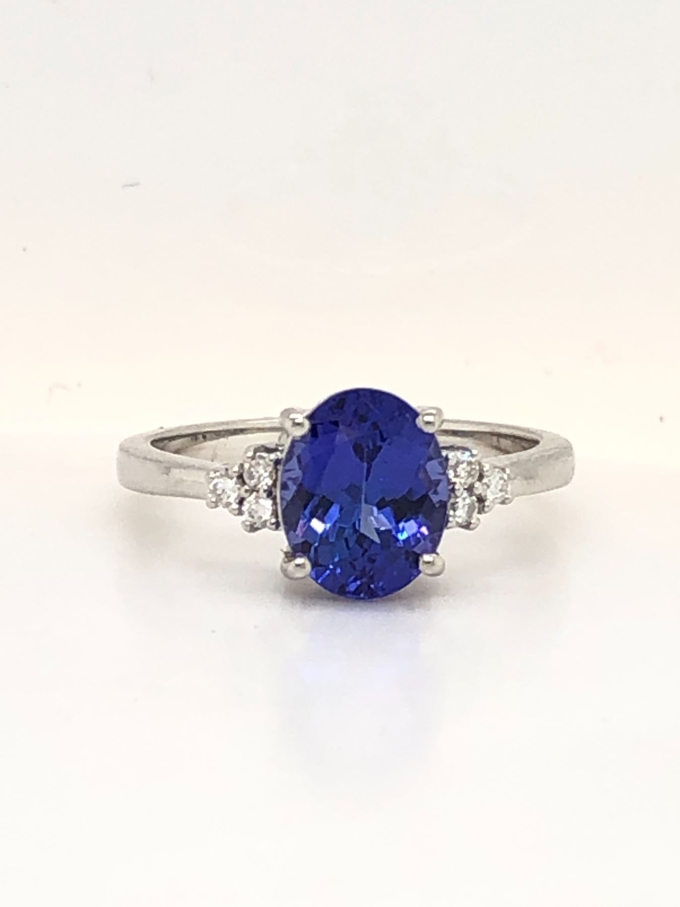 Genuine Tanzanite and Earth-Mined Diamond Ring.& nbsp;& nbsp;This is a 14 karat white gold ring with a 1.96 carat oval-cut tanzanite that is prong-set with .08 carats of round, brilliant-cut, H-I color, SI2 clarity diamonds on the shoulders.& nbsp; The ring is US size 7 with a supportive under gallery and a 2.2 mm shank.& nbsp; This ring can be resized for an additional $100, please allow an additional 10 days for shipping if we resize it.& nbsp; This ring is certified and appraised for $9,600.00 estimated retail replacement value.