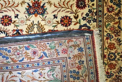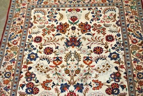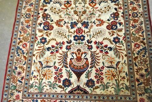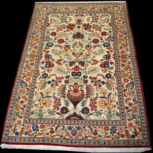 Simply spectacular Persian Kashan. Size 3.6 X 5.4 feet, made of fine quality baby lamb's wool pile on cotton foundation, all natural vegetable dye, incorporating a fascinating finely detailed free flowing floral pattern on a cream colored background, with a vase motif at the bottom. Contrasted beautifully by a darker colored intricate floral border, a truly great looking rug. Hand woven in Kashan, Iran.
