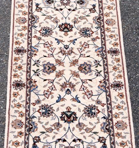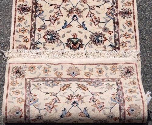Simply beautiful hand woven Kashan design Runner with silk highlights. Made of fine quality lamb and wool-part pure silk pile on cotton foundation, all natural vegetable dye, this beautiful Rug incorporates an allover free flowing floral pattern on a cream colored background and is framed beautifully by an intricately done floral border. The silk highlights in this Rug give it an extra layer of beauty and aesthetic appeal. Size: 2 feet 3 inches X 8 feet. Country of origin: Tibet.