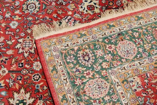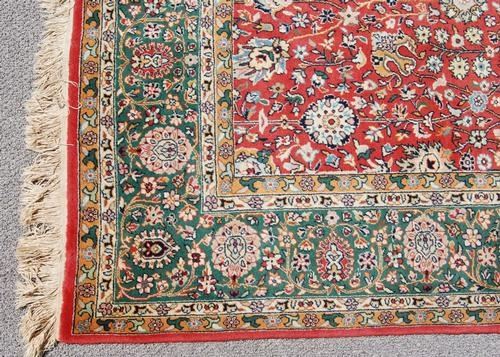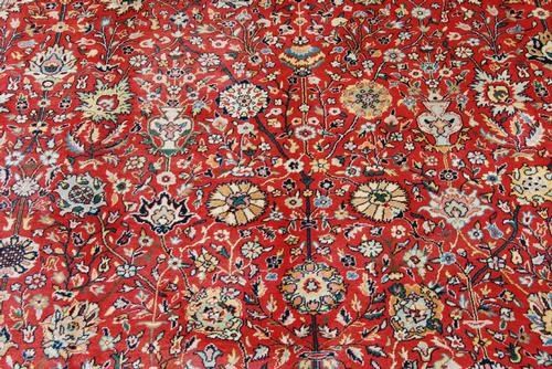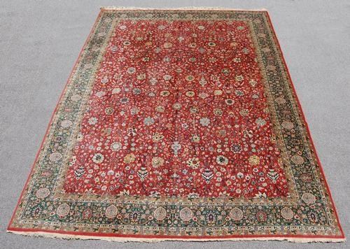 Beautifully fine quality handmade semi antique Tabriz design area Rug. Made of fine quality wool pile on cotton foundation. All natural vegetable dye, incorporating a finely detailed allover floral pattern on a rich red background with an intricately detailed floral border. Size: 8 feet 9 inches X 12 feet 2 inches. A very finely contrasted Rug.