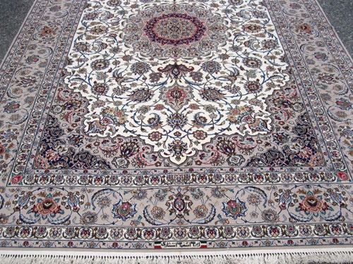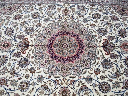 Simply breathtaking signed part silk Persian Isfahan rug. 100% natural, hand woven, vegetable dye, pure silk and highest quality baby lamb's wool pile on pure silk foundation. This remarkable Isfahan with its mesmerizing arabesque design and pattern is woven and signed by a master weaver named "Enteshari". It is rather rare to come across such a highly intricate fine Isfahan with a lovely sunburst central medallion with such exquisite crowned corners. While a typical rug is limited to a range of about twelve and sixteen colors, this striking piece features more than forty two different colors creating a tapestry of colors that is feast for the eyes. Please note, that the glowing silk high lights give this rug a three dimensional character. This fine Isfahan has over 400 knots per square inch and it takes a master weaver over three years to create this beauty. Attesting to the fine weave is the fact that the back of this rug looks as good as the front. Size: 10 feet X 7 feet . Country of origin: Iran.