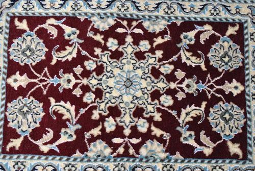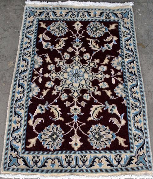 100% baby lamb and wool part silk on cotton foundation. Hand made vegetable dye Rug from city of Nain. Size: 3 feet X 1 feet 10 inches. Country of origin: Iran.