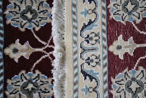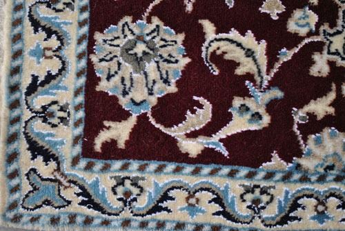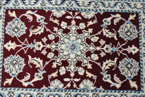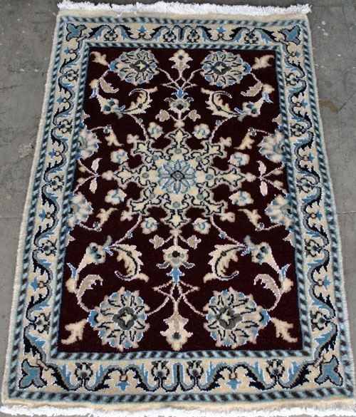 100% baby lamb and wool part silk on cotton foundation. Hand made vegetable dye rug from city of Nain. Size: 3 feet X 1 feet 10 inches. Country of origin: Iran.