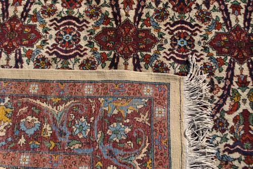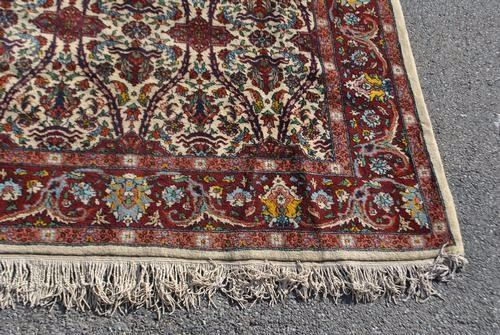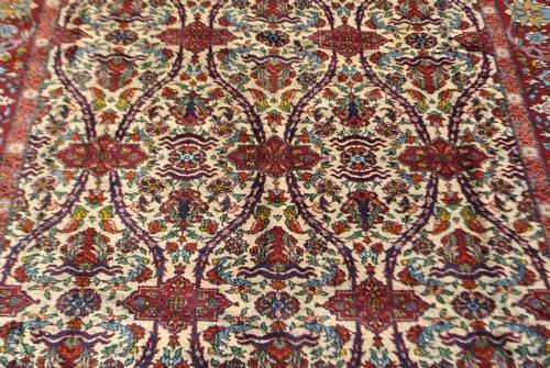 Simply mesmerizing Romanian Rug. Made of fine quality lamb's wool pile on cotton foundation, all natural vegetable dye, this fascinating rug employs an allover design utilizing a set of vibrantly colored floral motifs on a white background. Contrasted beuatifully by an intricately done floral border, this is truly a unique and one of a kind Rug. Hand woven in Romania. Size 7 feet 4 inches X 10 feet 4 inches.