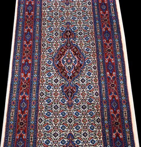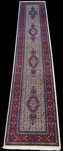 Simply splendid fine part silk Persian Moud-Mashad rug, 100%natural, vegetable dye, hand woven, pure silk and rarest baby lamb's wool pile on cotton foundation. This finely woven Moud-Mashad with its multiple medallions and stylized fish design on a beige background embodies the tangible form of a simple and complex at the same time, intricately, yet marvelously executed art form underfoot. This lovely piece is masterfully hand woven, knot by knot, using superior quality baby lamb's wool and it has about 200 knots per square inch. The lustrous and glowing silk highlights give this lovely piece an added three dimensional character. Moud is a satellite town in the proximity of Mashad, the capital of Khorasan province. In northwestern Iran. However the word Moud epitomizes the finest and most fabulous rugs of the Khorasan rug producing centers. Please notice that also attesting to the fine weave is the fact that the back of this rug looks as good as the front. Size: 13 feet 3 inches X 2 feet 6 inches. Country of Origin: Iran.
