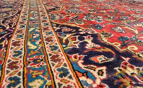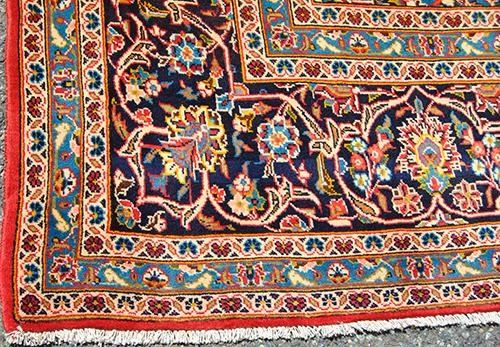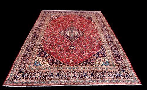Absolutely gorgeous and spectacular large Persian Kashan Rug. Made of all natural, vegetable, dyed, hand woven, baby lamb's wool pile on cotton foundation. Please notice the intricate design and well balanced color palette, combined with a superior baby lambs wool quality and highly dense weave, producing a well defined and crisp pattern. where a typical persian rug employs between twelve and sixteen colors, this lovely piece features over thirty eight different colors. this rug is masterfully hand woven, knot by knot, using superior quality baby lamb's wool with about 100 knots per square inch. It takes a master weaver over three years to create this beauty and bring it to the market. Please notice that also attesting to the fine weave is the fact that the back of this Rug looks as good as the front. The leather band sewn on the edge at the back of this rug is to keep the edges from curling under due to the extreme tightness of the weave. creases in this rug are due to fold and not a defect. Size 9 feet 11 inches X 14 feet 4 inches.