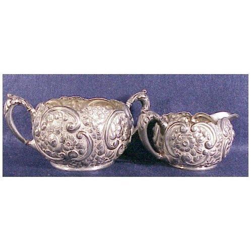 The Simpson Hall Miller repousse "roses" sugar and creamer have the number 170 on the base of each. <P> The open sugar has a mouth opening of 3 1/4", the creamer 2 1/2". The open sugar is 2 3/4" tall, the creamer2 1/8". <P> They are in good condition.