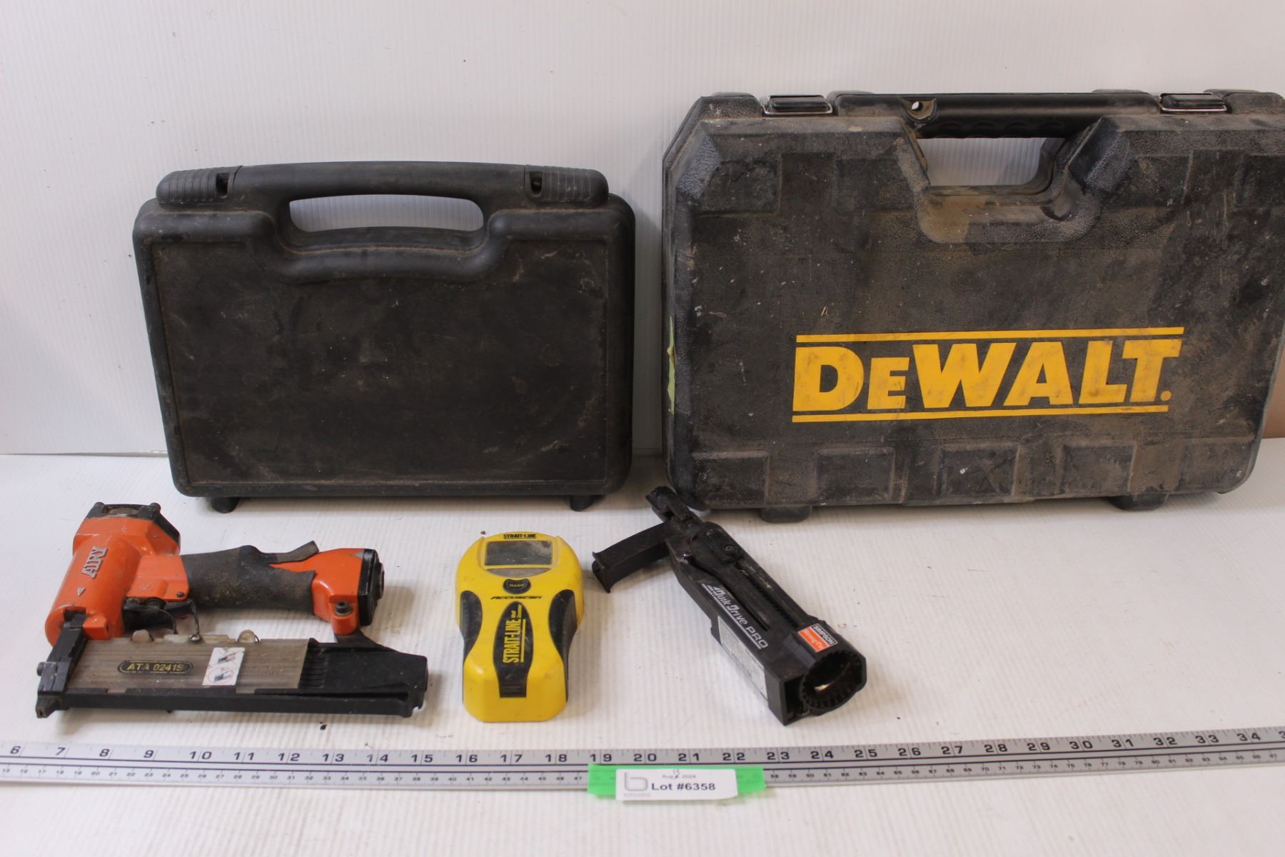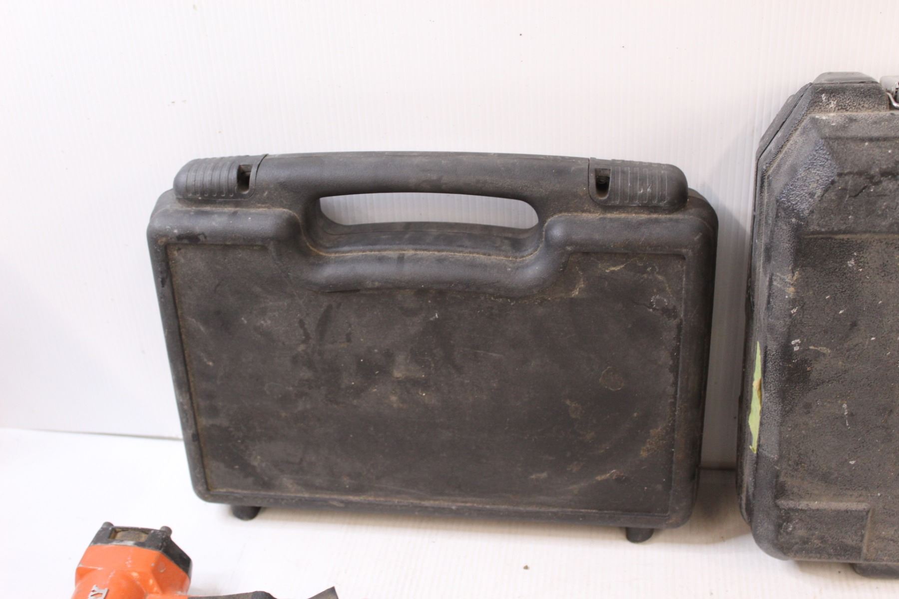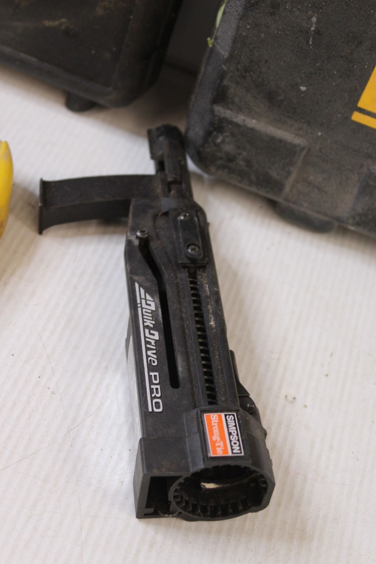Simpson Quik Drive Pro Tool (untested), Straight Laser Line (as is), Airy Air Nailer (untested), (2) Tool Boxes (No Tools)