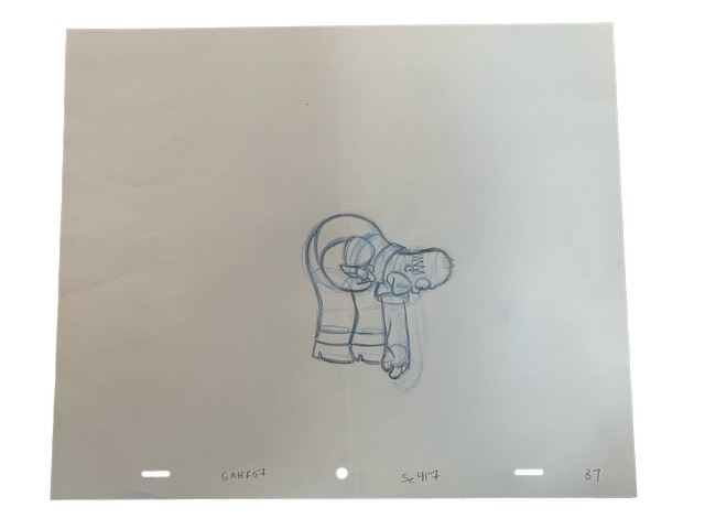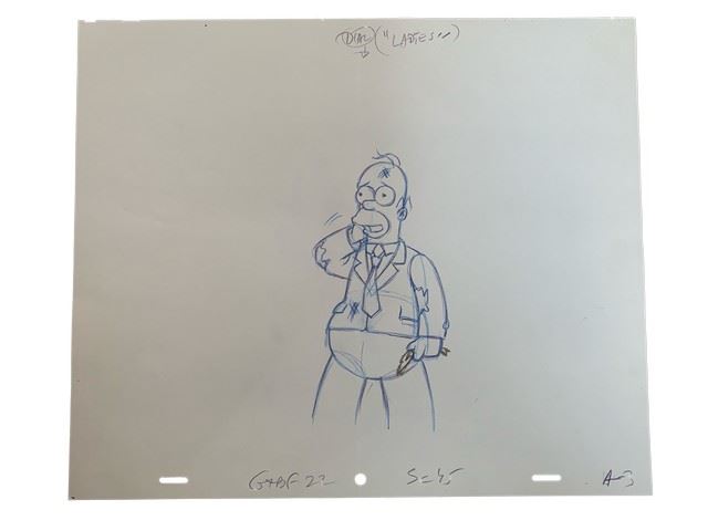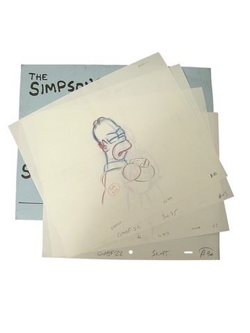 A great collectable for "Simpsons" fans. These are actual original production animation pencil sketches that are then transferred to the color cells. Each contains all the animators notes and continuity numbering, and has been created on keyed and registered animation paper. All are contained in the original production folder. (Folder approx. 14 1/2" x 11 1/2")