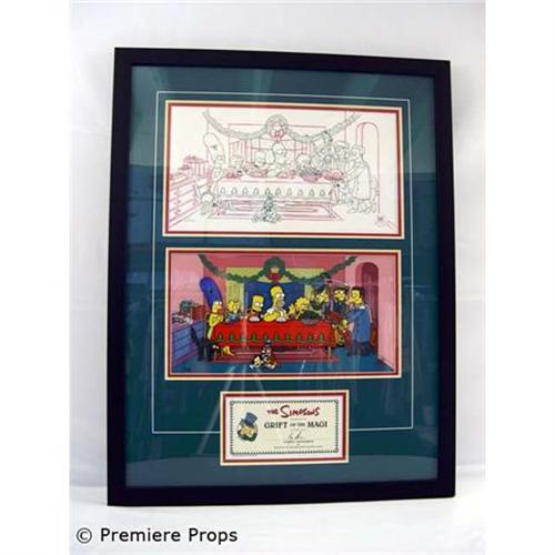 "The Simpsons - Grift of the Magi" limited edition hand-painted cel highlighted with full color background and layout drawing in a black wooden frame w/ glass enclosure. Comes with certificate of authenticity. (approx. 24" x 32" x 1") (ACMA2053)