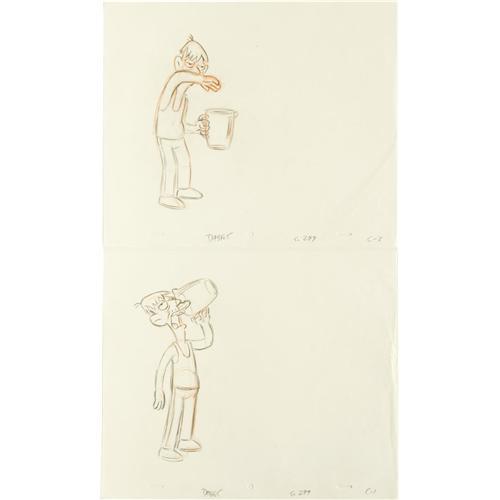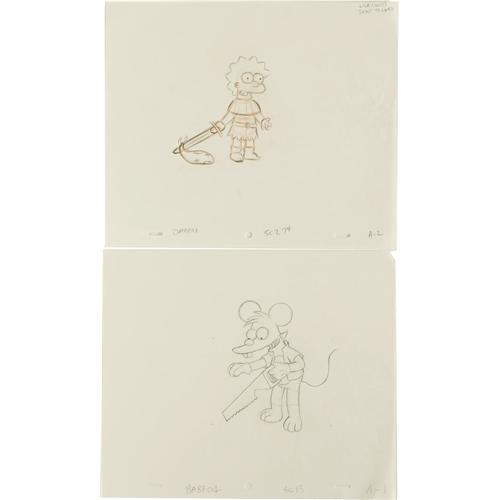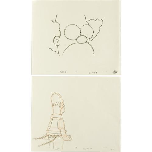 <B>Simpsons Set of Production Sketches.</B></I> A set of ten production sketches, each in pencil on paper, from various "Simpsons" episodes. Included are drawings of Homer (on hunger strike in "Hungry Hungry Homer"), Lisa (as Joan of Arc in "Tales From the Public Domain"), Cletus, Grandpa Simpson, Andy Warhol, Itchy, Principal Skinner, Fat Tony, and a nice extreme close-up of Krusty the Klown. All are in Excellent condition.