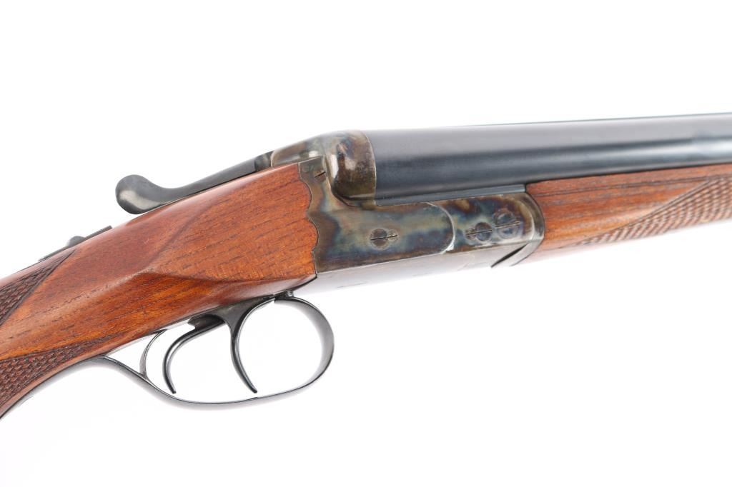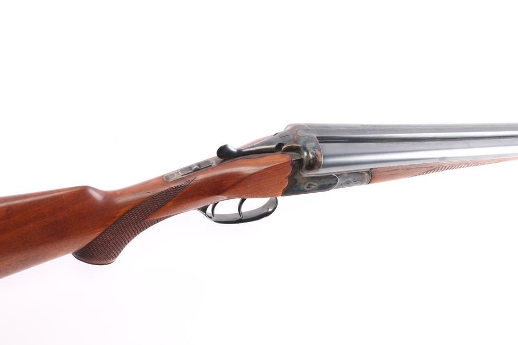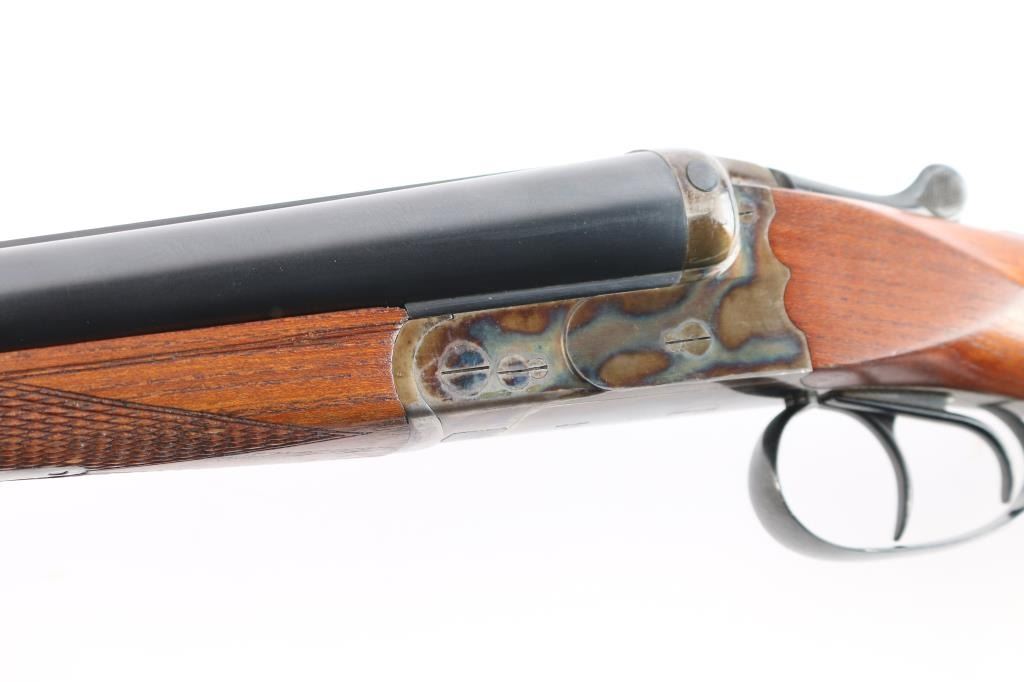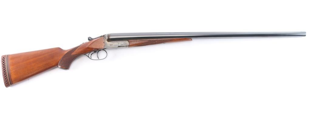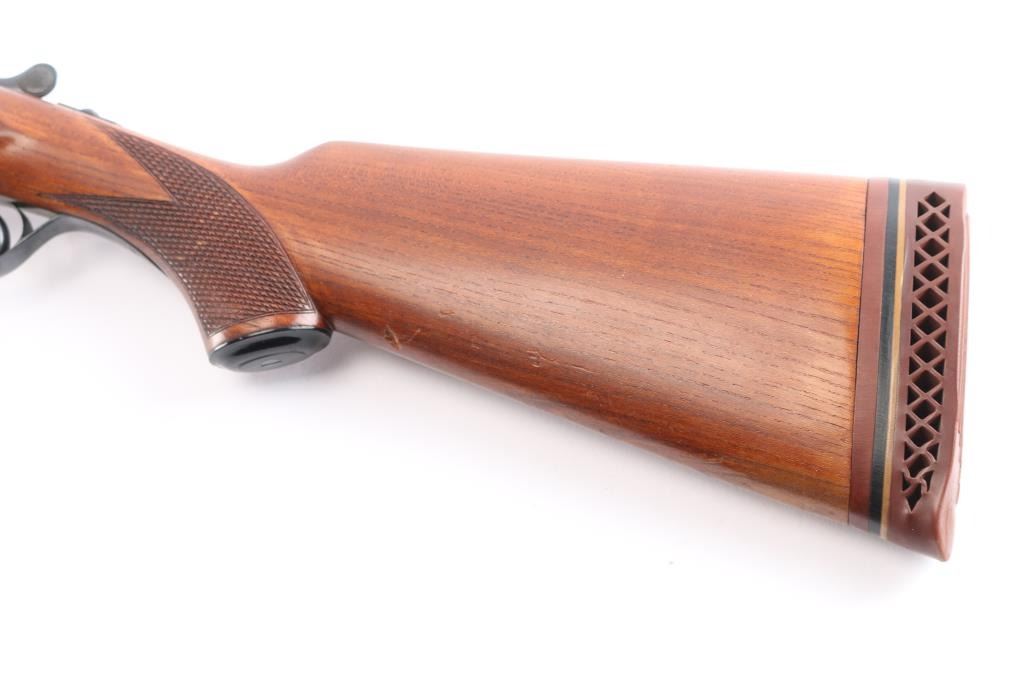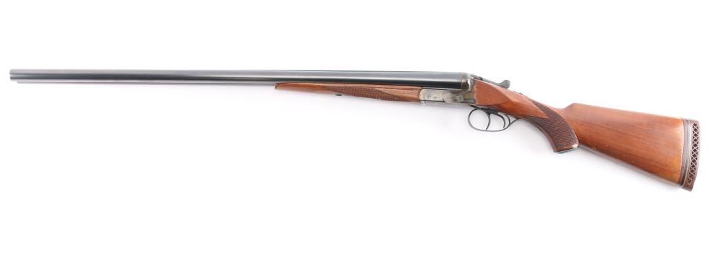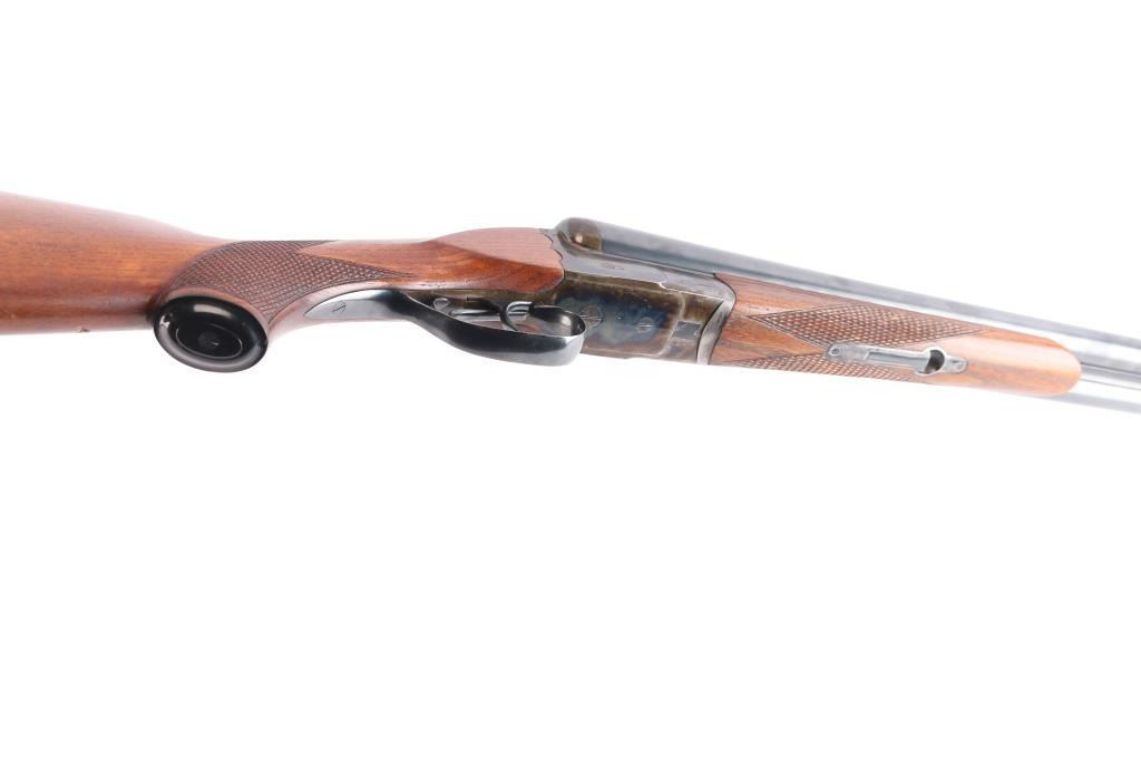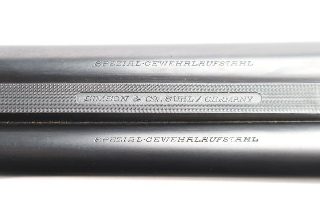 German made hammerless box-lock side-by-side double barreled shotgun chambered in 12 Gauge manufactured circa 1951 in Suhl(Thuringen), Germany. Before WWII Simson was an independent company, and during the late thirties the Third Reich took over the Jewish owned company and renamed it 'BSW'. After the war, Suhl was "behind the curtain" in East Germany, so Merkel, Fortunas (East German Sauers), and Simson were all made in the same factory. After the unification of Germany, Simson later became a private label of Merkel, especially for export. It features double 28" ribbed blued barrels, a 'full' left bore and 'IM' right bore (measured with a drop-in gauge), 70mm chambers (2.756"), dual smooth curved triggers with a 14" length-of-pull, brass bead front sight, cocking indicators, extractors, scalloped boxlock action and sliding tang safety. The wood furniture consists of an checkered splinter forend with color-case hardened hardware, a semi-pistol grip buttstock with checkering at the wrist, black plastic grip cap, and a Pachmayr ventilated rubber recoil pad. The receiver is color-case hardened along with the metal on the forend, and the barrel, top lever, and trigger guard are blued. The overall original blued finish retained is approximately 98% with very little edge wear. The color-case finish is approximately 95% intact with carry wear. Wood furniture is very good with a small gouge behind the grip area on the buttstock, some missing points, and light handling wear on the remaining wood. The action is smooth and crisp, with bright excellent bores.