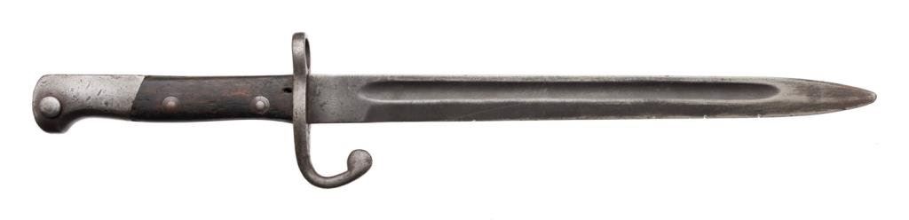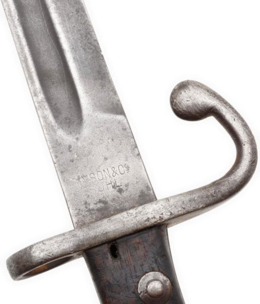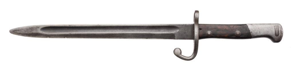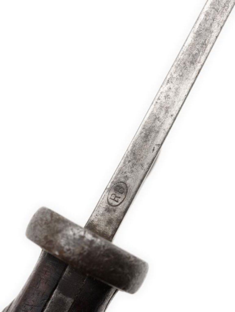 Simson & Co. Suhl marked German bayonet. The bayonet is in overall good condition with an 11 ½” blade and overall length of 16 ½”. The blade retains significant original military finish with small dings to the blade. The smooth wood scales are worn and show heavy use. No scabbard. Est.: $50-$75.