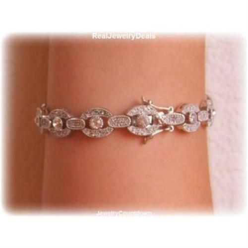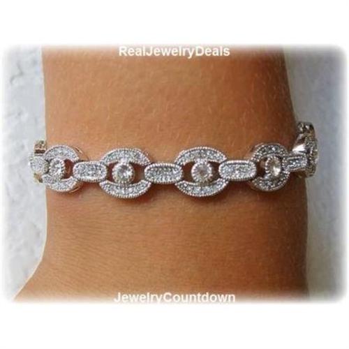 This classical, Solid Sterling Silver Bracelet has a vintage style. Large, thick links are set with dozens of sparkling, simulated diamonds. Look at the detailed, quality workmanship. See specifications below.<BR><BR> 100% Satisfaction Guaranteed....if you don't LOVE this item, simply return it within 14 business days for a complete refund or your purchase price.