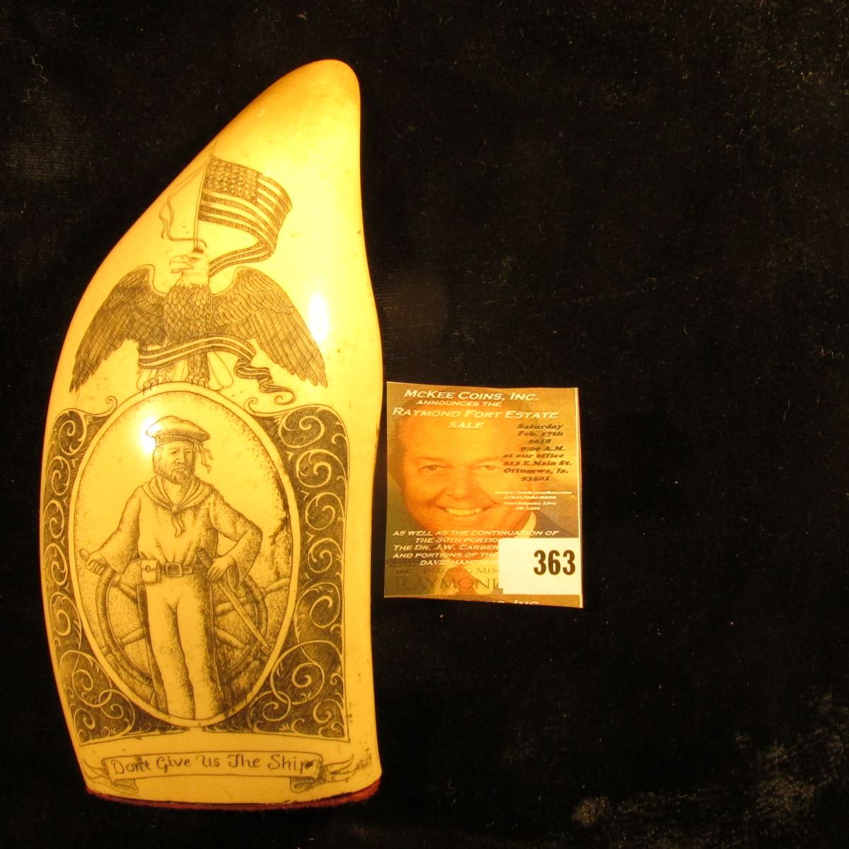 Simulated Whale Tooth with engraving of a Sailor and Eagle with U.S. Flag "Don't give us the Ship". 6 1/2" x 2 1/2".
