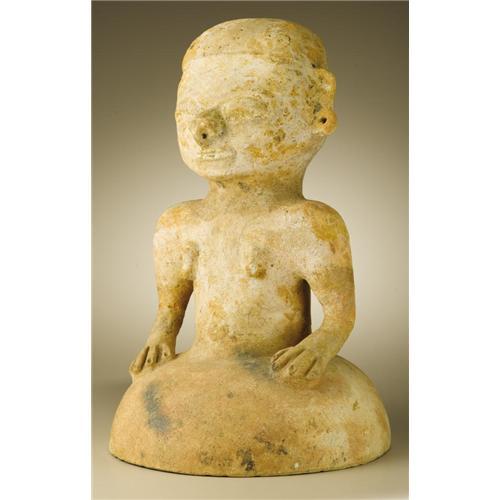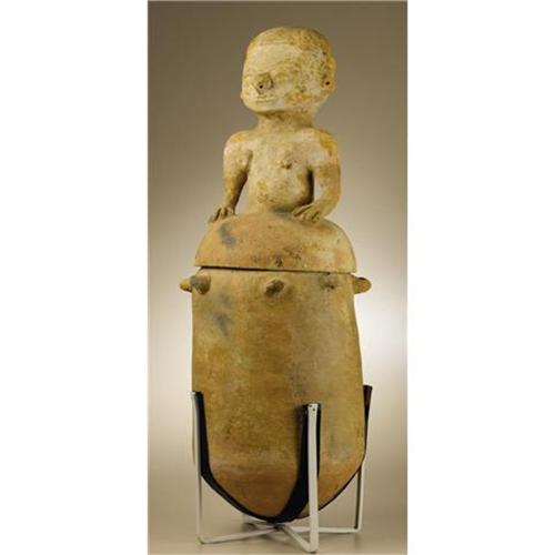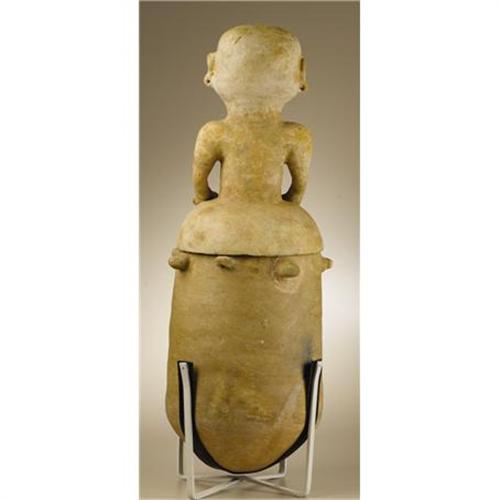 <B>Large Burial Urn with Human Half-figure on Lid</B></I><BR>Sinú (?)<BR>A.D. 1200 - 1500<BR>Buff ceramic<BR>Lid: Height 16 in. Diameter 10 ½ in.<BR>Urn: Height 15 1/2 in. Diameter 12 1/2 in.<BR><BR>The alertly-posed female half-figure is formally closest to published examples in the Moskito Style of the lower Magdalena River region in greater Sinú. Wearing only earspools and a nose ornament, the figure has closely cropped hair in a cap-like style. Such large globular jars were used for secondary burials. The forehead has a small patch, and there are cracks and chips along with light surface stain and abrasions on the lid. The urn was broken in a number of pieces and has been reassembled with some fill.<BR><BR>Provenance<BR>Bonhams & Butterfields, San Francisco: sale 7437E, 9 June 2003, lot 5029, p.10<BR><BR>