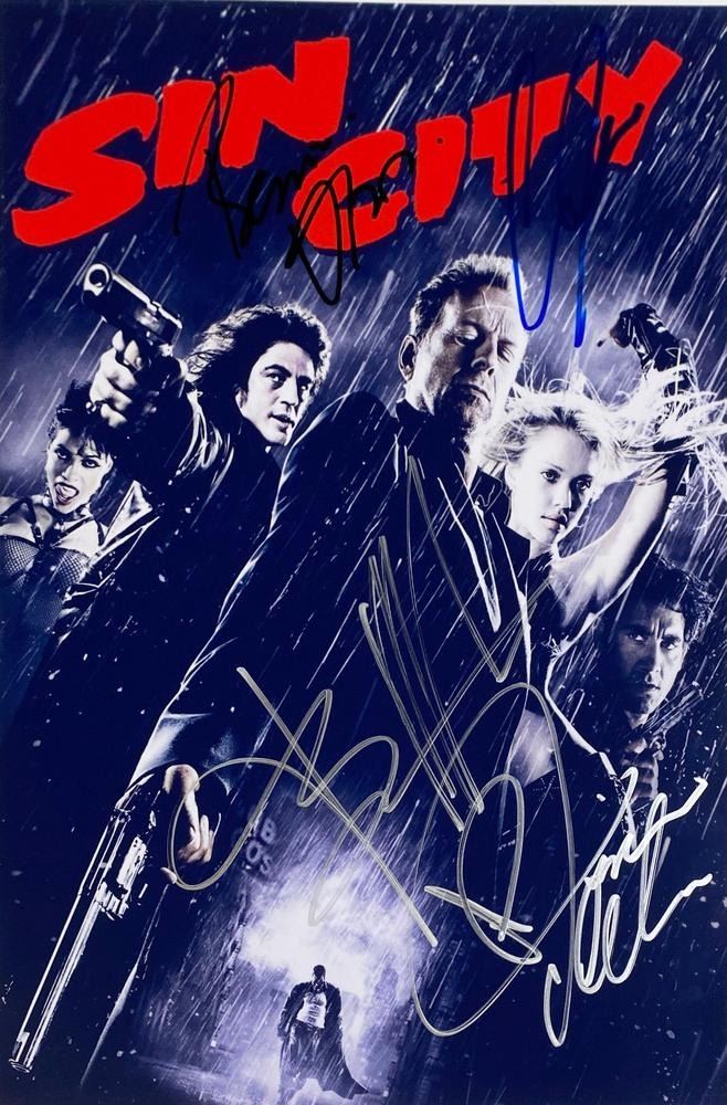 Sin City cast facsimile signed movie photo autographed by Clive Owen, Bruce Willis, Jessica Alba and Benicio del Toro. 8x10 inches. This item is a reprint of an original autograph