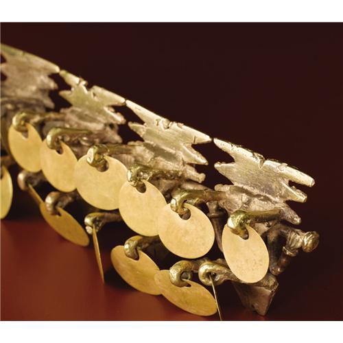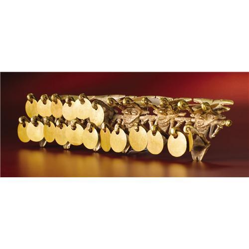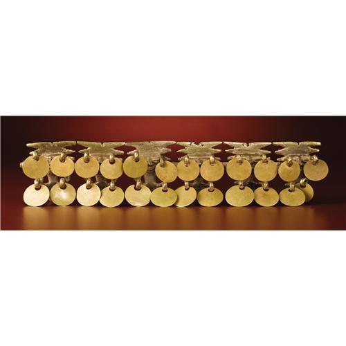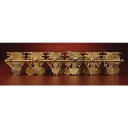 <B>Large Bar Pectoral with Six Shamanic Figures</B></I><BR>Sinú<BR>A.D. 100 - 700<BR>Gold, Weight 308 grams<BR>Height 1 ¾ in. Width 9 3/16 in.<BR><BR>This exceptionally large, pinkish gold bar pectoral would have virtually spanned the wearer's entire chest. Six shaman figures grasp with both hands the connecting bar. Their torsos end in a bifurcated point, and each wears a necklace and bracelets. Three-tiered headdresses suggestive of bird wings terminate at either side in points. Four circular danglers vibrate in front of each figure from integrally-cast loop extensions. The condition is excellent.<BR><BR>The lot is sold with a statement of authenticity from the distinguished expert Robert Sonin.<BR><BR>Provenance<BR>David Bernstein, New York<BR><BR>