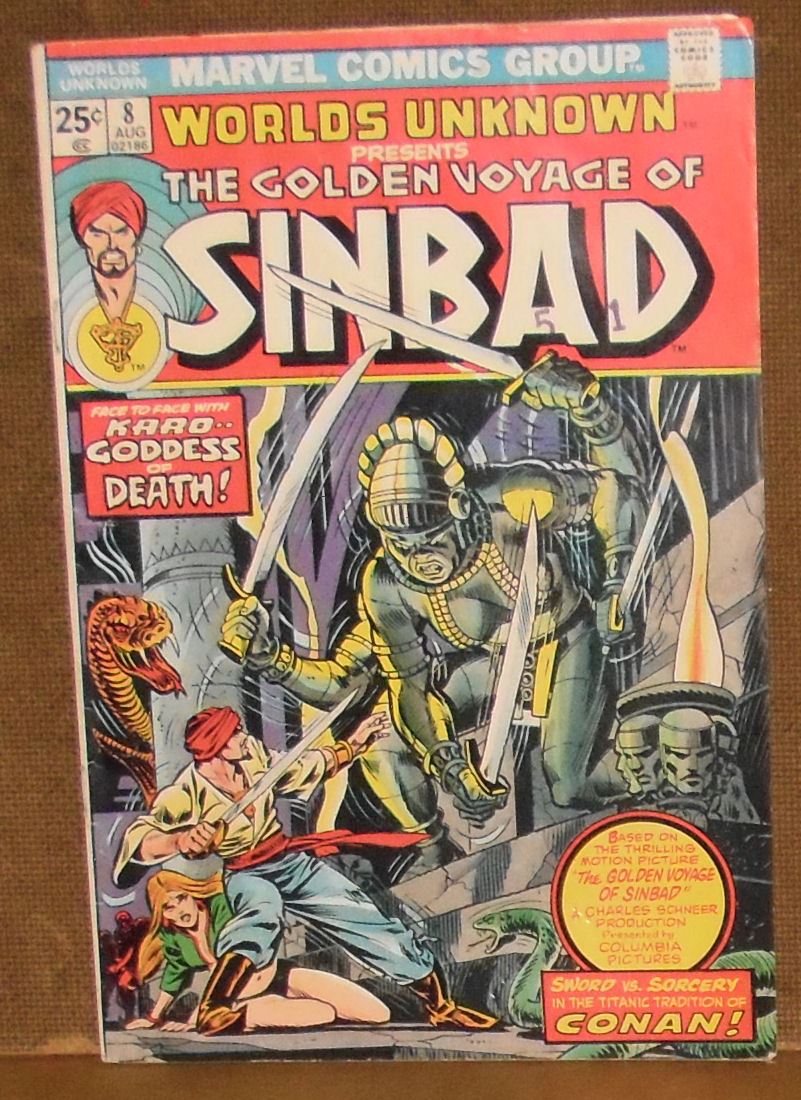 Worth more than 15$: "The Golden Voyage of Sinbad" an very old 25 cents Marvel Comics volume 1, #8, 1974 interesting adventurous super hero collectible comic book, with 'Land of the Lost', as is in near mint or mint (looks like mint as it seems pages are NOT read yet); add to your collection now or start one.