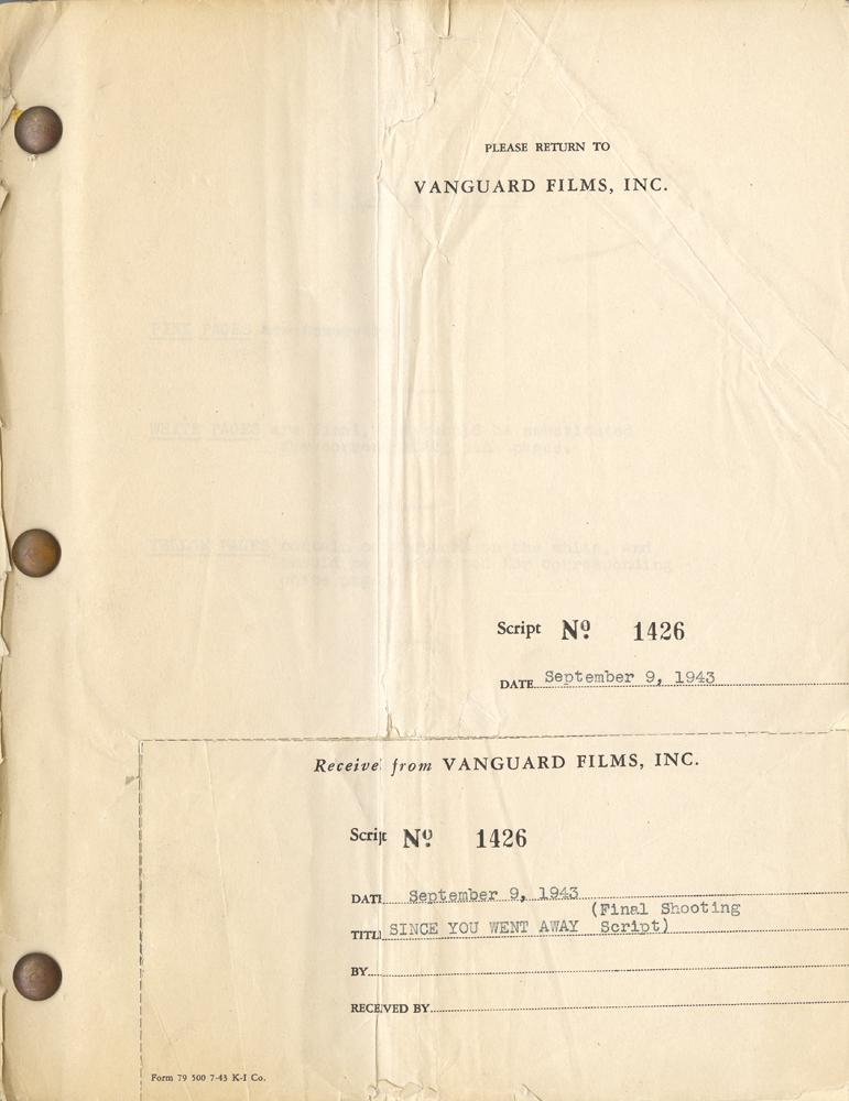 (Vanguard Films, 1944) Original studio final shooting script, dated September 9, 1943, for SINCE YOU WENT AWAY by Margaret Buell Wilder from her own book. One of Selznick’s most prestigious films, it won an Academy Award for best music, and was nominated for eight others including best picture. Studio clasps, 290 pages, missing front cover, contains color correction pages. Very good with minor handling.