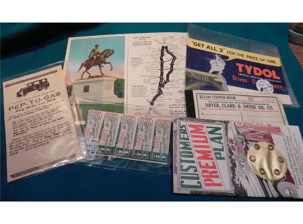 Sinclair “Customers' Premium Plan” Booklet; “A $100 Business for 25c Pep-To-Gas May Make You Rich...” flyer; (5) Coupons from “Oklahoma Cities Service Oil Co. Delaware” Scrip; “Gulf” Postcard depicting Statue of Major General Anthony Wayne; “Tydol Triple-Action Gasoline” Booklet; & a coupon book from “Dryer, Clark, & Dryer Oil Co.