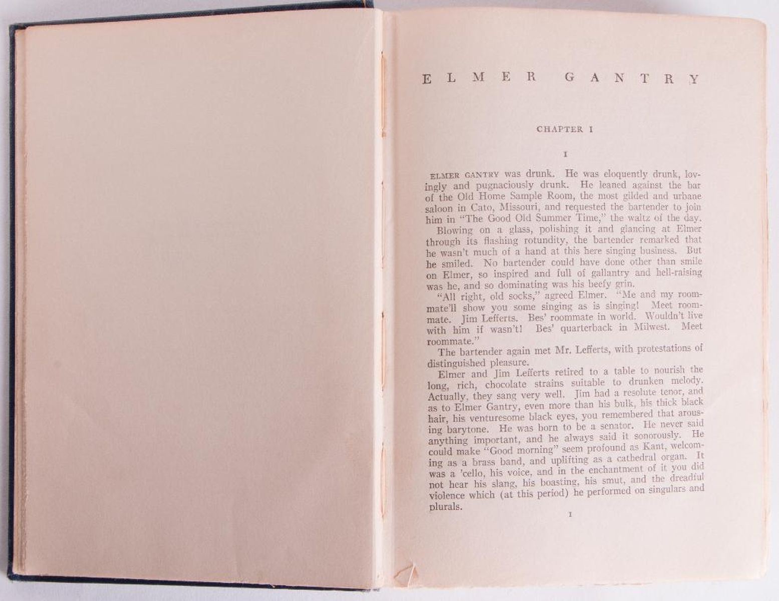 Title: Elmer Gantry Author: Sinclair Lewis Place: New York Publisher: Harcourt, Brace and Company Inc. Date: 1927 Description: First edition. Hardcover. Bright blue cloth with orange writing and backing. Condition: Good. Missing dust jacket. Rubbing and sunning to spine. Pencil mark on page 272.