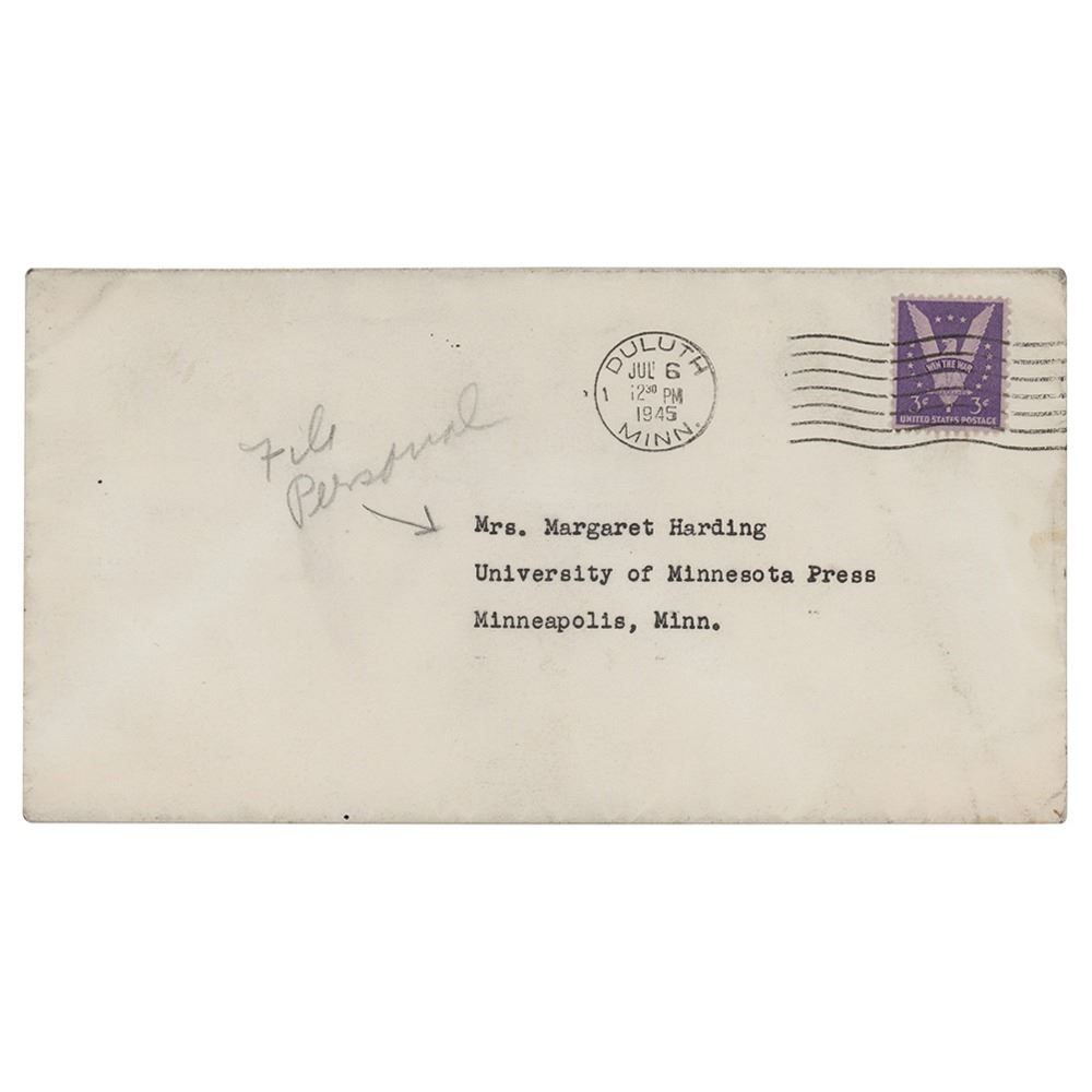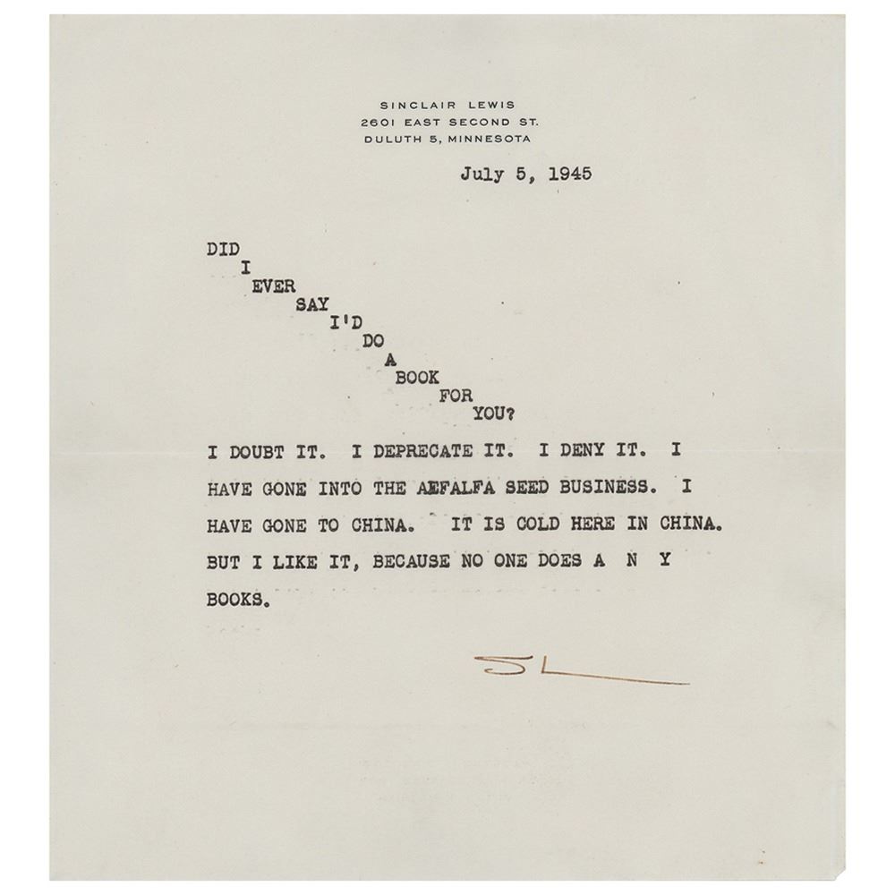 TLS signed “S. L.,†one page, 7.25 x 7.75, personal letterhead, July 5, 1945. Annoyed letter to Margaret Harding of the University of Minnesota Press. In full: "Did I ever say I'd do a book for you? I doubt it. I deprecate it. I deny it. I have gone into the alfalfa seed business. I have gone to China. It is cold here in China. But I like it, because no one does any books." In fine condition. Accompanied by the original mailing envelope, postmarked at Duluth, Minnesota.