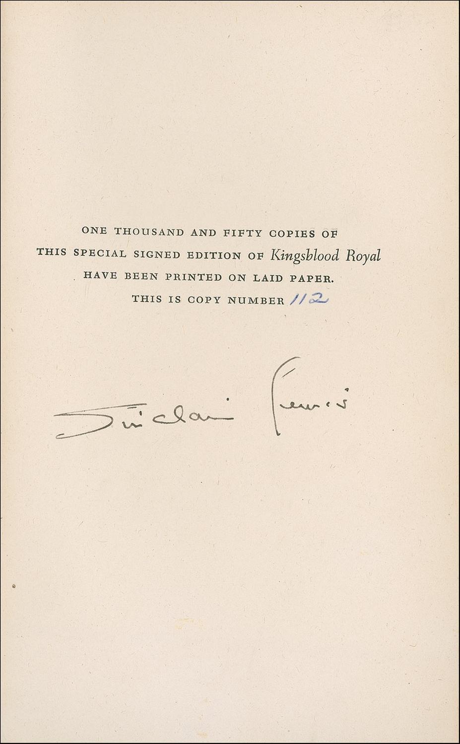 Signed book: Kingsblood Royal. Limited first edition of 1050 copies (this copy No. 112). NY: Random House, 1947. Hardcover with slipcase, 5.75 x 8.25. Signed in fountain pen on the limitation page. Some light wear and flaking to slipcase and owner’s ink stamp to front free end page, otherwise fine condition.