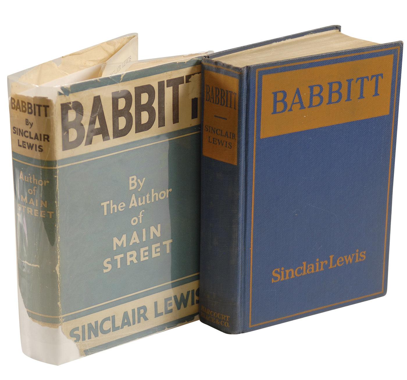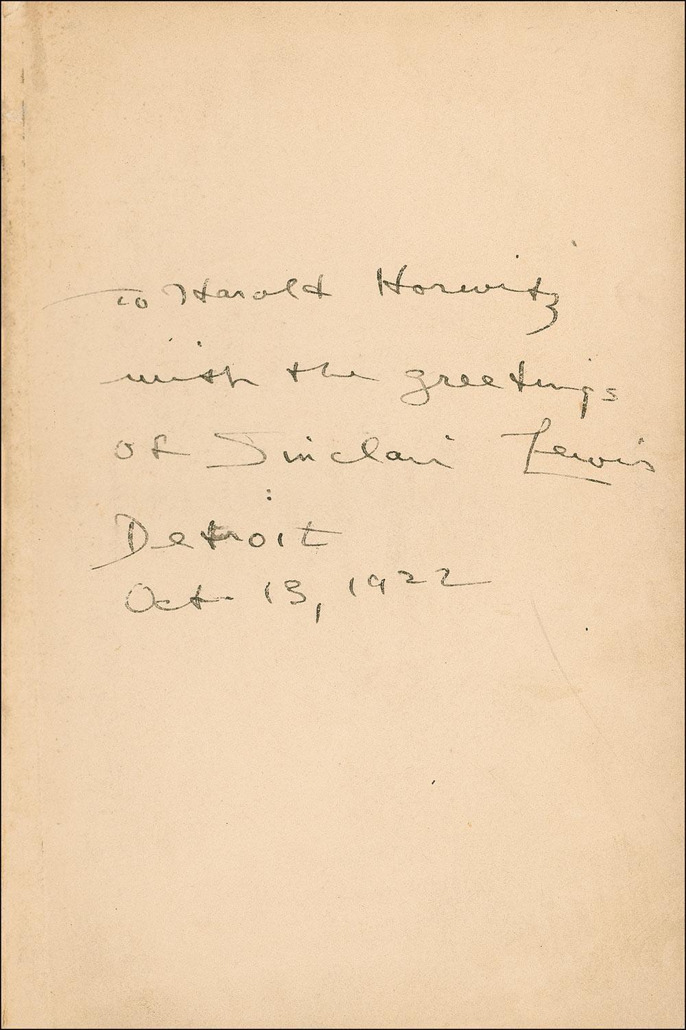 Signed book: Babbit. First edition, first printing. NY: Harcourt, Brace and Company, 1922. Hardcover with dustjacket, 5.25 x 7.5, 401 pages. Signed and inscribed on the first free end page, “To Harold Horowitz, with the greetings of Sinclair Lewis, Detroit, Oct. 13, 1922.” Toning and soiling to signed page, separation along front hinge, light foxing to pastedowns and fore-edges, and scattered toning and wear to the slightly loose spine. Dustjacket is clipped inside, and shows scattered creasing, toning and soiling, a few areas of paper loss (heaviest to spine) and label remnants to top of front, otherwise very good condition (the back of the jacket is an order form for other Harcourt titles).