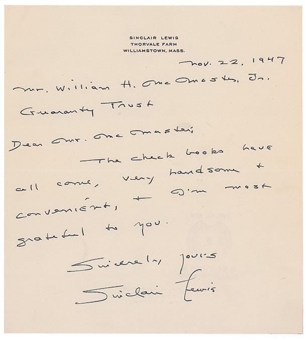 ALS, one page, 7.25 x 8, personal letterhead, November 22, 1947. Brief letter of thanks to his bank. In full: “The check books have all come, very handsome & convenient, & I’m most grateful to you.” In fine condition, with a few scattered light creases.