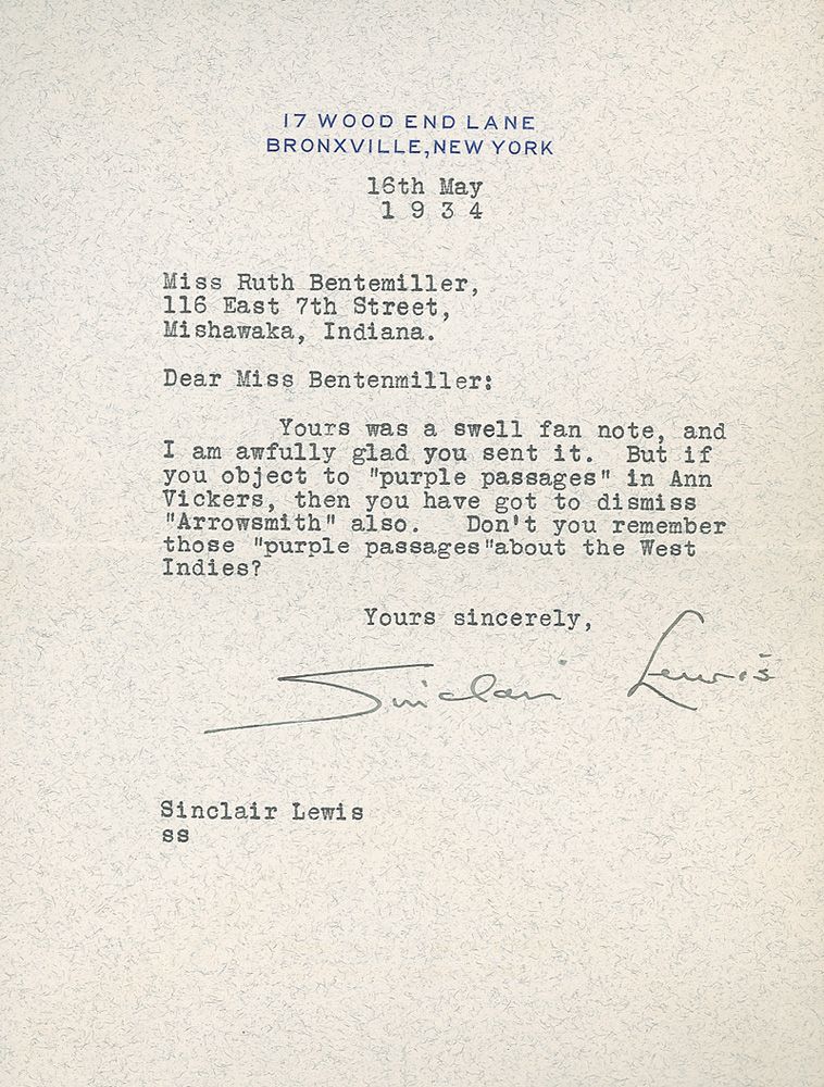 TLS, one page, 5.75 x 7.5, personal letterhead, May 16, 1934. Letter to an admirer. In full: “Yours was a swell fan note, and I am awfully glad you sent it. But if you object to ‘purple passages’ in Ann Vickers, then you have got to dismiss ‘Arrowsmith’ also. Don’t you remember those ‘purple passages’ about the West Indies?” In fine condition. Accompanied by the original mailing envelope.