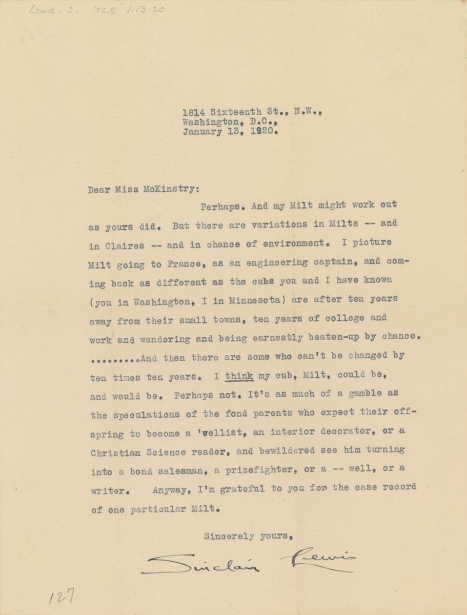 TLS, one page, 8.25 x 11, January 13, 1920. Letter to Miss McKinstry, in part: “My Milt might work out as yours did. But there are variations in Milts—and in Claires—and in chance of environment. I picture Milt gong to France, as an engineering captain, and coming back as different as the cubs you and I have known…are after ten years away from their small towns, ten years of college and work and wandering and being earnestly beaten-up by chance…And then there are some who can’t be changed by ten times ten years. I think my cub, Milt, could be, and would be. Perhaps not, it’s as much of a gamble as the speculations of the fond parents who expect their offspring to become a cellist, an interior decorator, or a Christian Science reader, and bewildered see him turning into a bond salesman, a prizefighter, or a —well, or a writer.” In fine condition.