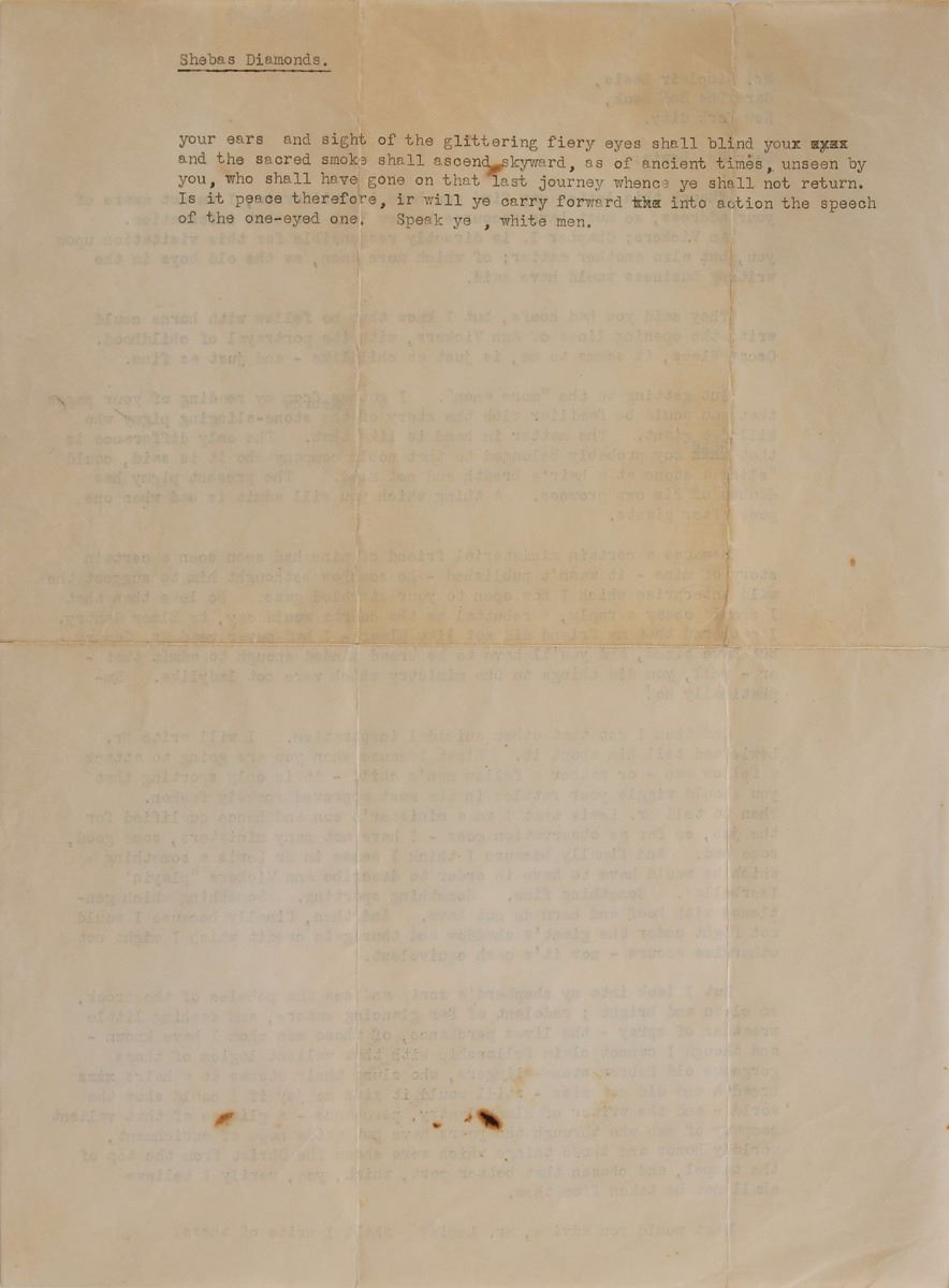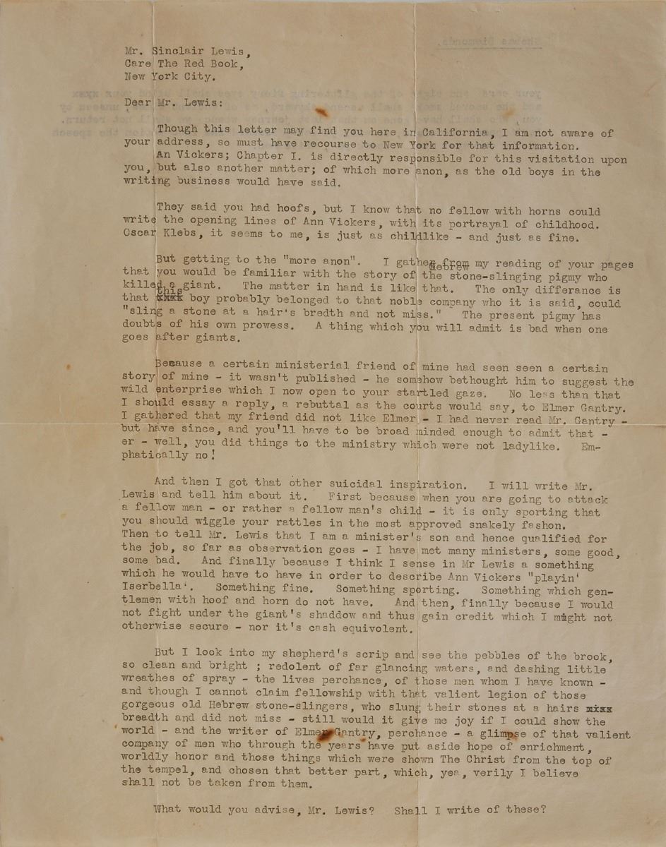 ALS, two pages on two adjoining sheets, 5.25 x 7, September 16, 1932. In full: “By all means write of the ministry as good shepherds. But why would that be a ‘rebuttal to Elmer Gantry’? In that book several fine & spiritual pastors are praised. Is it a service to a noble company, then to praise the scoundrels among them also?” In fine condition. Accompanied by a carbon copy of the original, rambling letter to Lewis concerning Elmer Gantry and a booklet by Lewis entitled Cheap & Contented Labor.