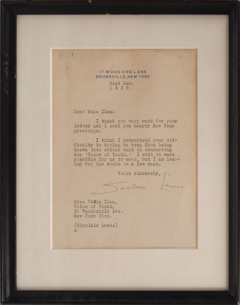 TLS, one page, 5.25 x 7, 17 Wood End Lane letterhead, December 31, 1935. Letter to Viola Lima, in full: “Thank you very much for your letter and I send you hearty New Year greetings. I think I understand your difficulty in trying to keep from being drawn into either cult in conducting the ‘Voice of Youth.’ I wish it were possible for us to meet, but I am leaving for the South in a few days.” Matted and framed. In fine condition.
