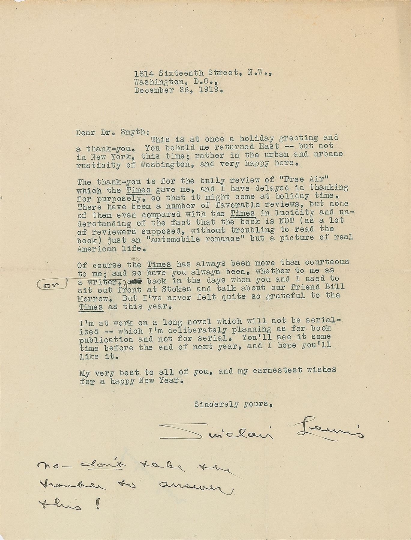 TLS, one page, 8.25 x 11, December 26, 1919. Letter to Dr. Smyth, in part: "The thank-you is for the bully review of 'Free Air' which the Times gave me, and I have delayed in thanking for purposely, so that it might come at holiday time. There have been a number of favorable reviews, but none of them even compared with the Times in lucidity and understanding of the fact that the book is NOT (as a lot of reviewers supposed, without troubling to read the book) just an 'automobile romance' but a picture of real American life. Of course the Times has always been more courtesy to me; and so have you always been, whether to me as a writer, or back in the days when you and I used to sit out front at Stokes and talk about our friend Bill Morrow. But I've never felt quite so grateful to the Times as this year. I'm at work on a long novel which will not be serialized—which I'm deliberately planning as for book publication and not for serial. You'll see it some time before the end of next year, and I hope you'll like it." Lewis adds a couple corrections in his own hand, as well as a brief postscript: "No—don't take the trouble to answer this!" In fine condition.