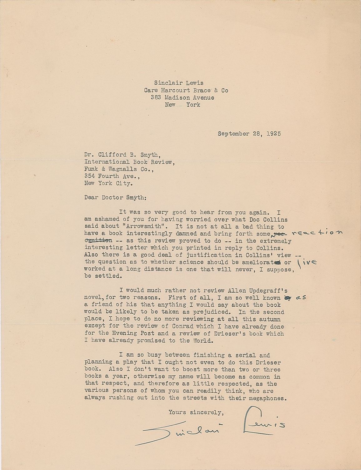 TLS, one page, 8.5 x 11, September 28, 1925. Letter to Clifford B. Smyth of the International Book Review, in part: "I am ashamed of you for having worried over what Doc Collins said about the 'Arrowsmith.' It is not at all a bad thing to have a book interestingly damned and bring forth some reaction—as this review proved to do—in the extremely interesting letter which you printed in reply to Collins. Also there is a good deal of justification in Collins' view—the question as to whether science should be ameliorative or worked at a long distance is one that will never, I suppose, be settled….I hope to do no more reviewing at all this autumn except for the review of Conrad which I have already done for the Evening Post and a review of Drieser's book which I have already promised to the World." Lewis corrects a few lines in his own hand. In fine condition.