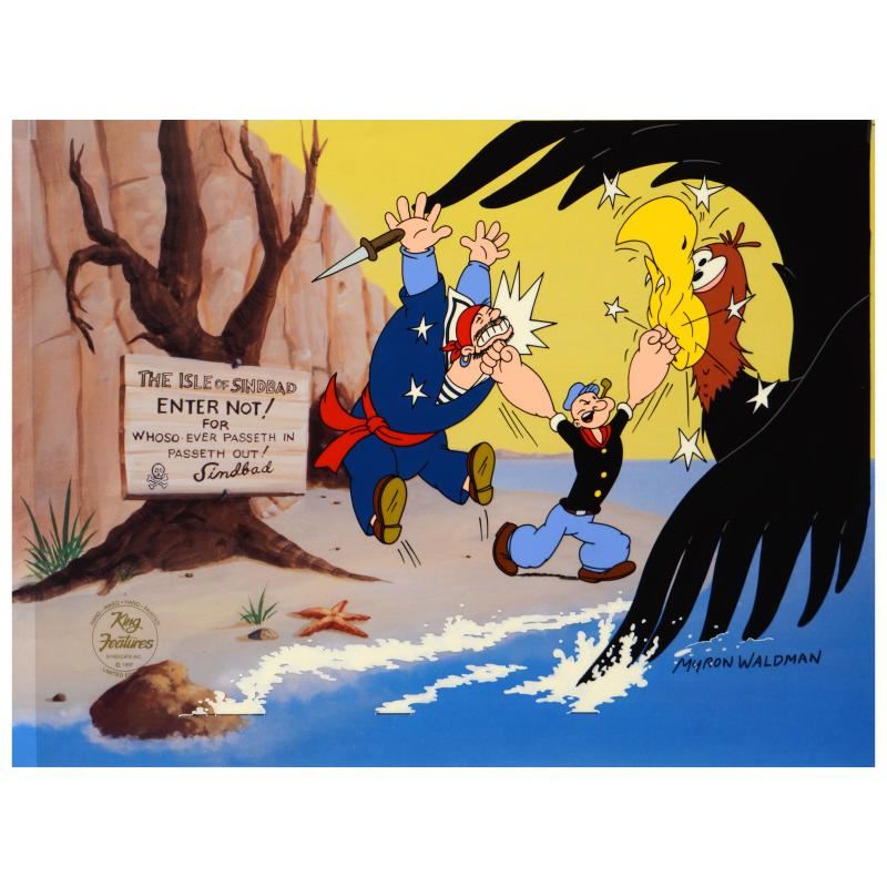 "Sindbad" is a limited edition hand inked and hand painted animation cel with background, numbered and hand signed by Myron Waldman (1908-2006). Includes Certificate of Authenticity! Measures approx. 24" x 18" (background), 15" x 11" (cel).